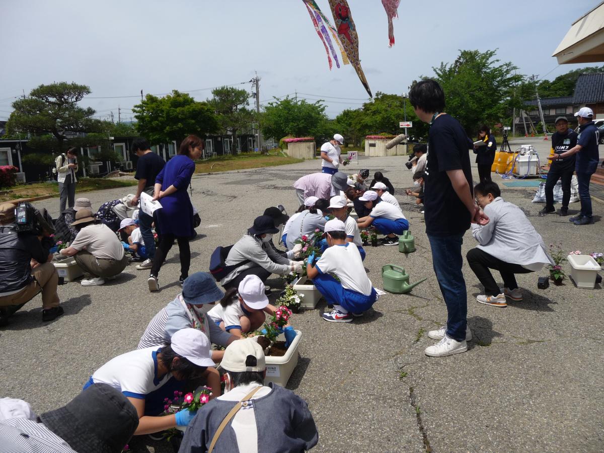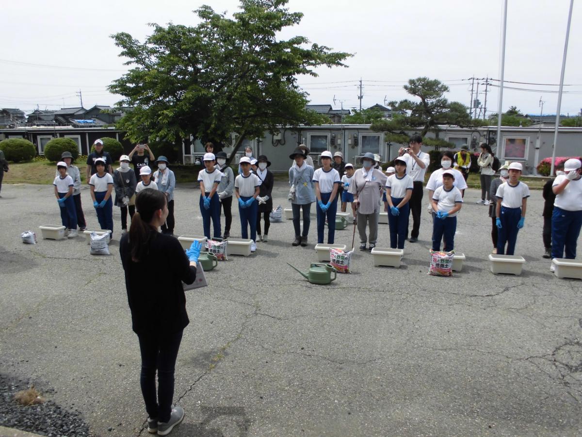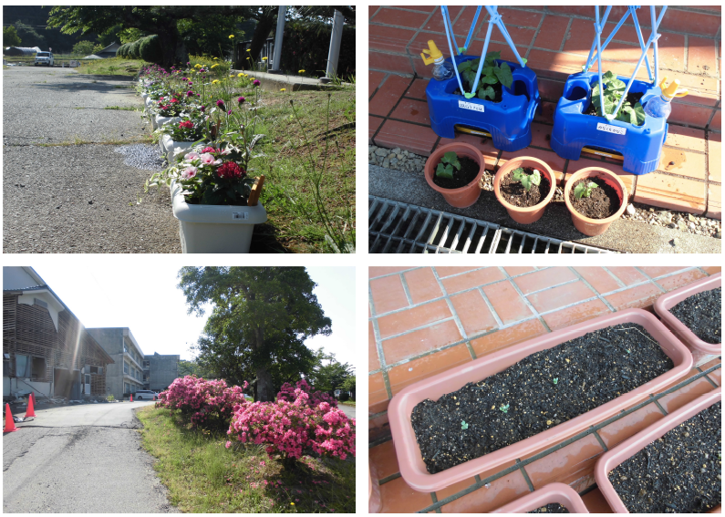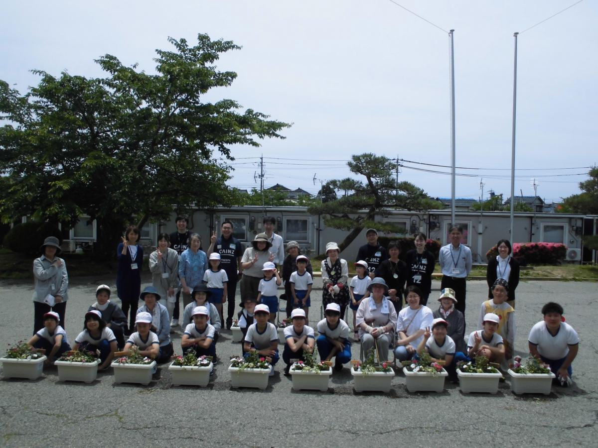 植えたプランターは、校舎と仮設住宅の間に並べて置きました。平日は児童が、土日は仮設住宅等の皆さんが水やり等を行う予定です。一緒に手をかけて一緒にたくさんの花を咲かすことができたらいいなと思います。今回をきっかけに、今後も児童と仮設住宅等にお住いの皆さんが定期的に関わる活動に取り組んでまいります。7月には、仮設住宅集会所で子どもたちが準備したプログラムで関わる活動を計画中です。お楽しみに!