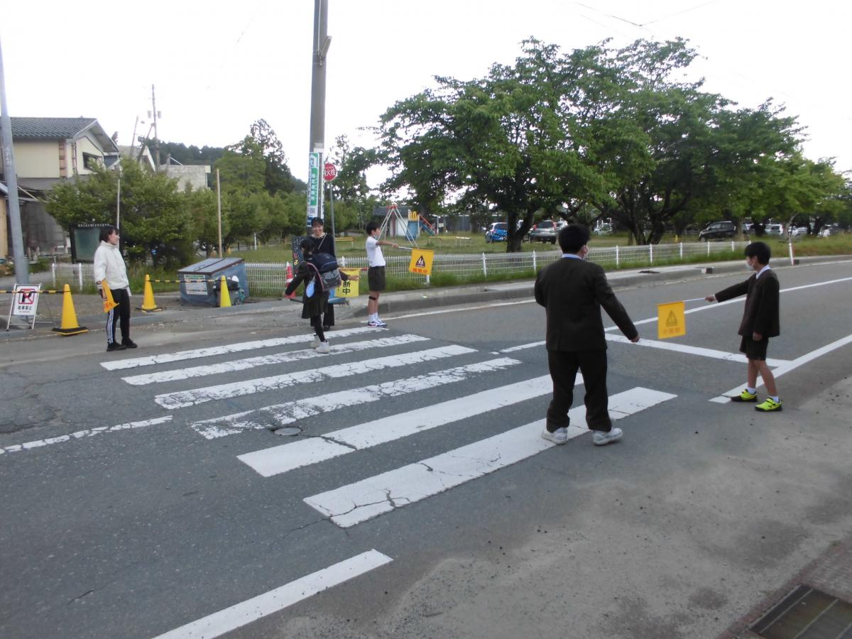 毎月、月初めの日は保護者と児童、職員での朝の交通安全指導を行っています。4日(火)は、保護者・6年生3名・職員2名で学校前横断歩道で行いました。みんなで旗を持ち、登校してくる児童や止まって下さる車に挨拶しながらにぎやかに行うことができました。