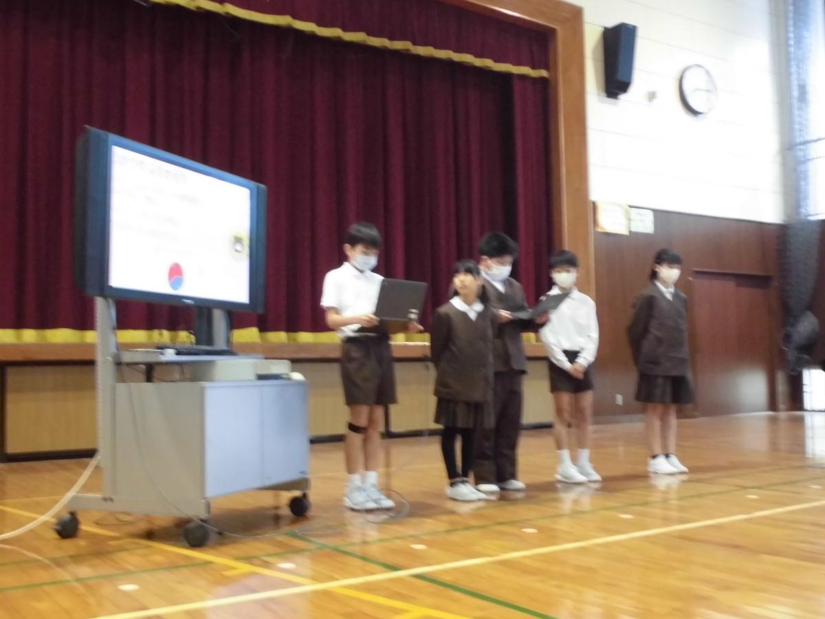 4日(火)、火曜日の朝は児童集会です。最初に今日から本校に戻ってきてくれた2年児童の紹介を行いました。本人からは「よろしくお願いします!」とのあいさつ。みんなで拍手してお迎えできました。次に2つの委員会から5月の振り返りと、6月のめあてや活動内容を紹介してくれました。話し合った内容で、計画的に活動に取り組んでくれることを願っています。