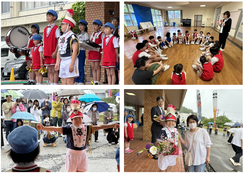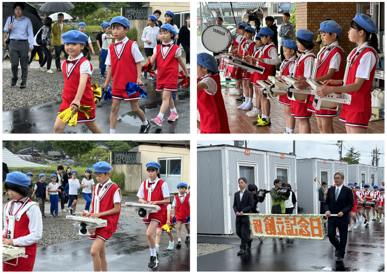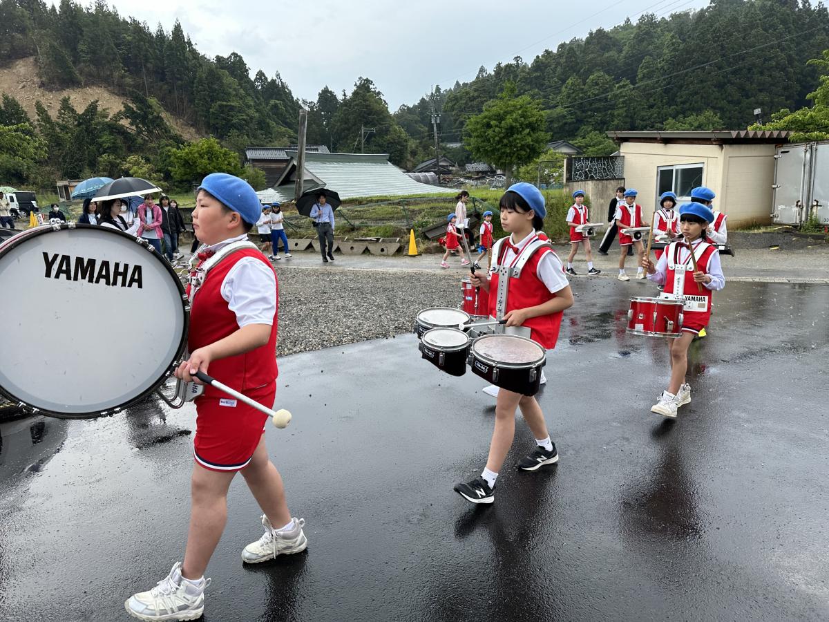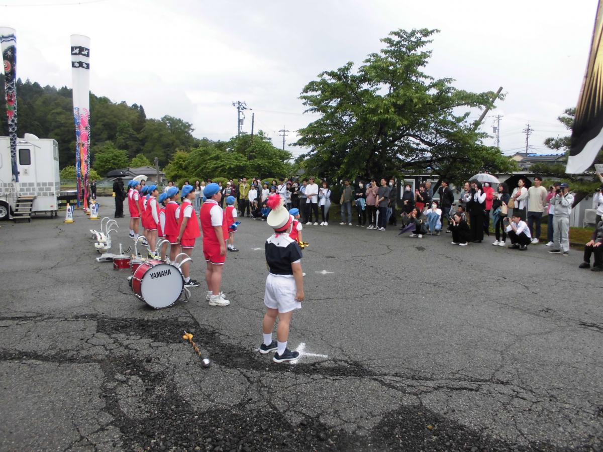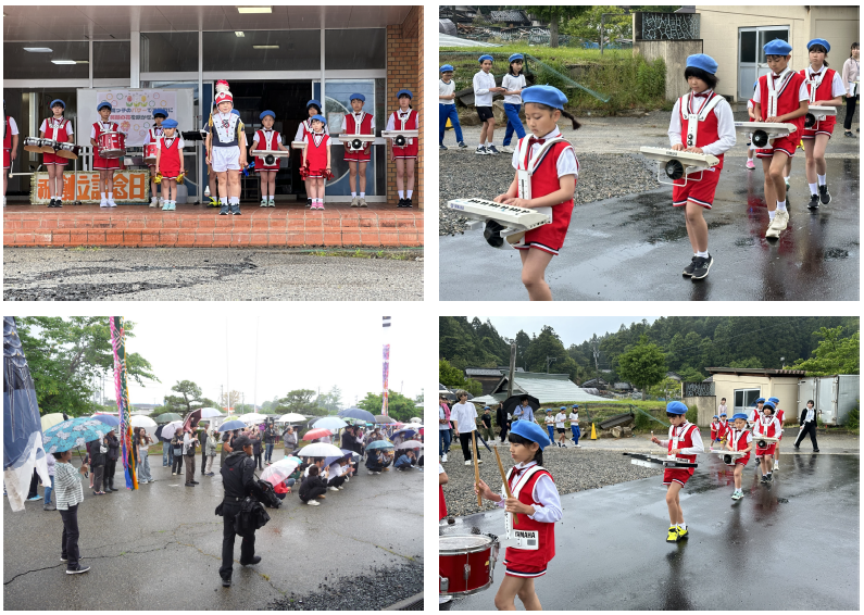 当日は朝からあいにくの雨。正院っ子の伝統を守り、正院っ子のパワー=精一杯の姿を見せることで正院町に笑顔の花を咲かせたい!その思いを伝えるにはどうしても仮設住宅の中を、堂々を行進したい!天からの恵みか、パレード開始時刻には雨がやみ、少し晴れ間があるとの予報。子どもたちの思いを地域の皆さんに届けるために、コースを短縮し、仮設住宅の中を行進することができました。仮設住宅の皆さんは、玄関前に出てきて下さりたくさんの笑顔と声援と拍手を下さいました。仮設住宅内をひと回りして、学校玄関前での停止演奏、いつも以上のたくさんの地域の皆さんが子どもたちの演奏を見に来て下さっていました。演奏している子どもたちの姿からは緊張感と熱い思いを感じました。自分たちの精一杯で、最後までやりきった児童は全員笑顔でした。「自分たちも地域の一員。皆さんのために何かしたい!」そんな子どもたちの思いが実現した時間ともなりました。