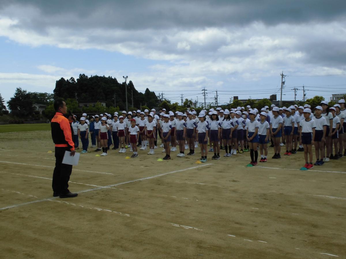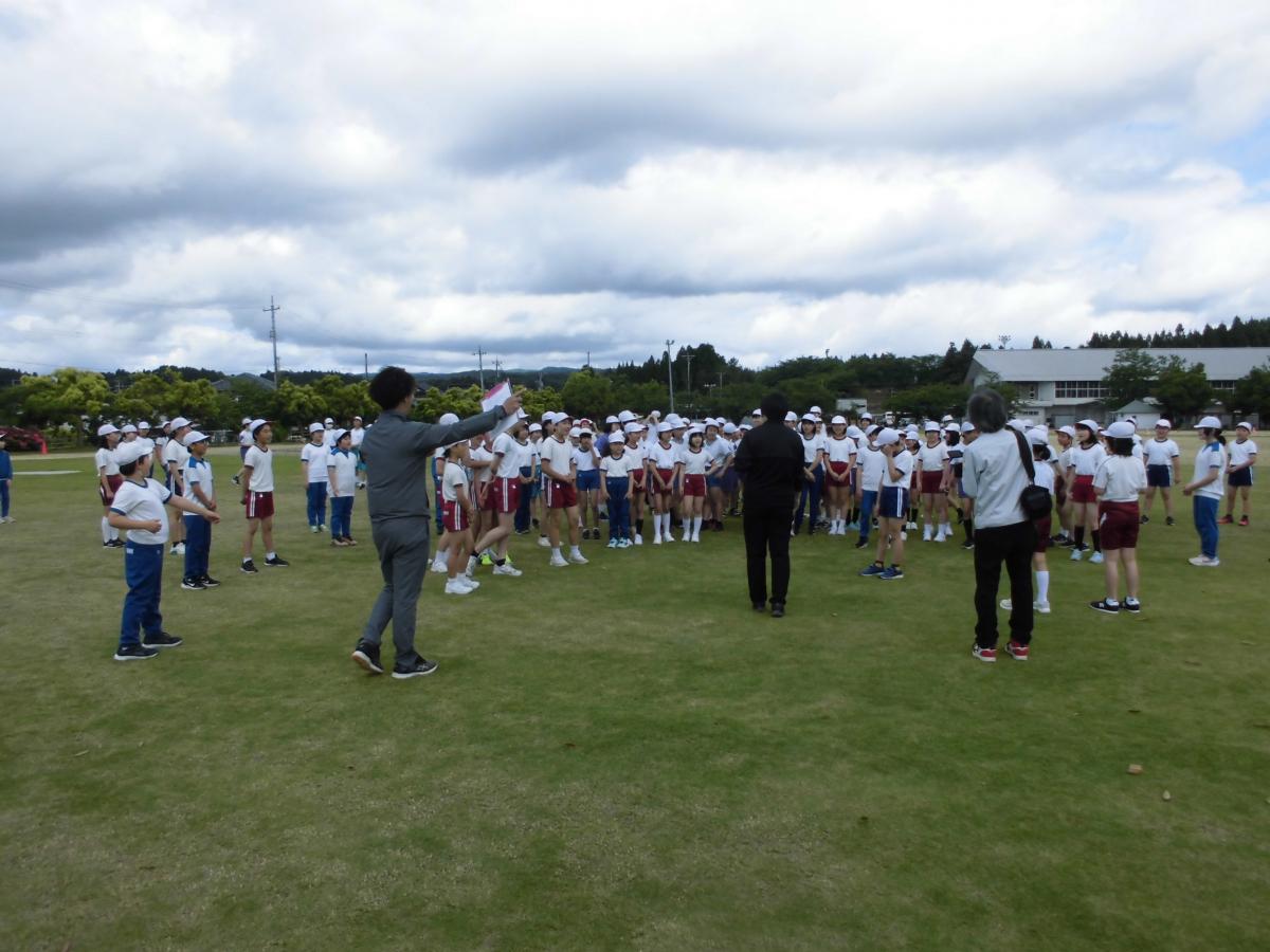 5日(水)、市内の4~6年生が集って体育交歓会が行われました。例年1学期に、各校で体力テストが行われますが、各校のグラウンドの状況をふまえ、みんなで集まって50m走やソフトボール投げの記録を測定する会でした。