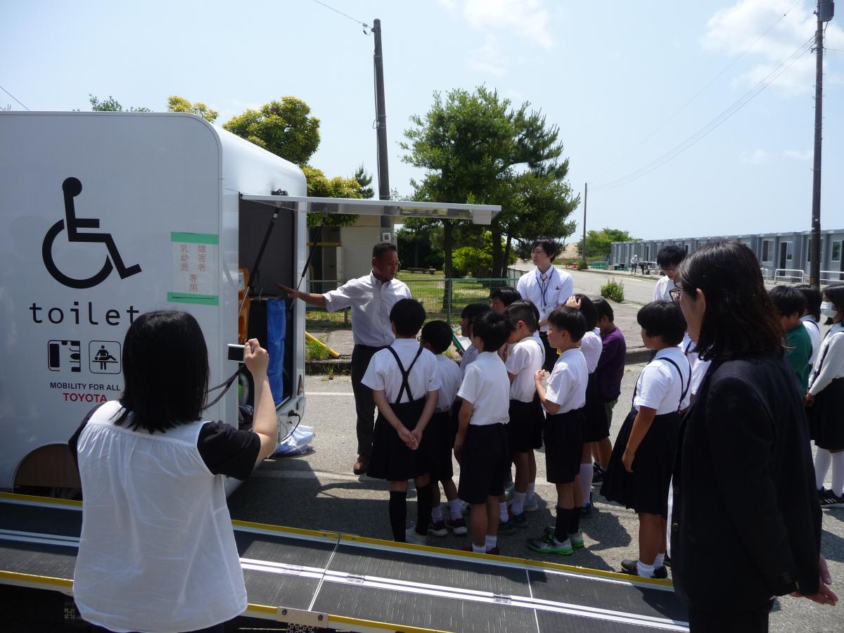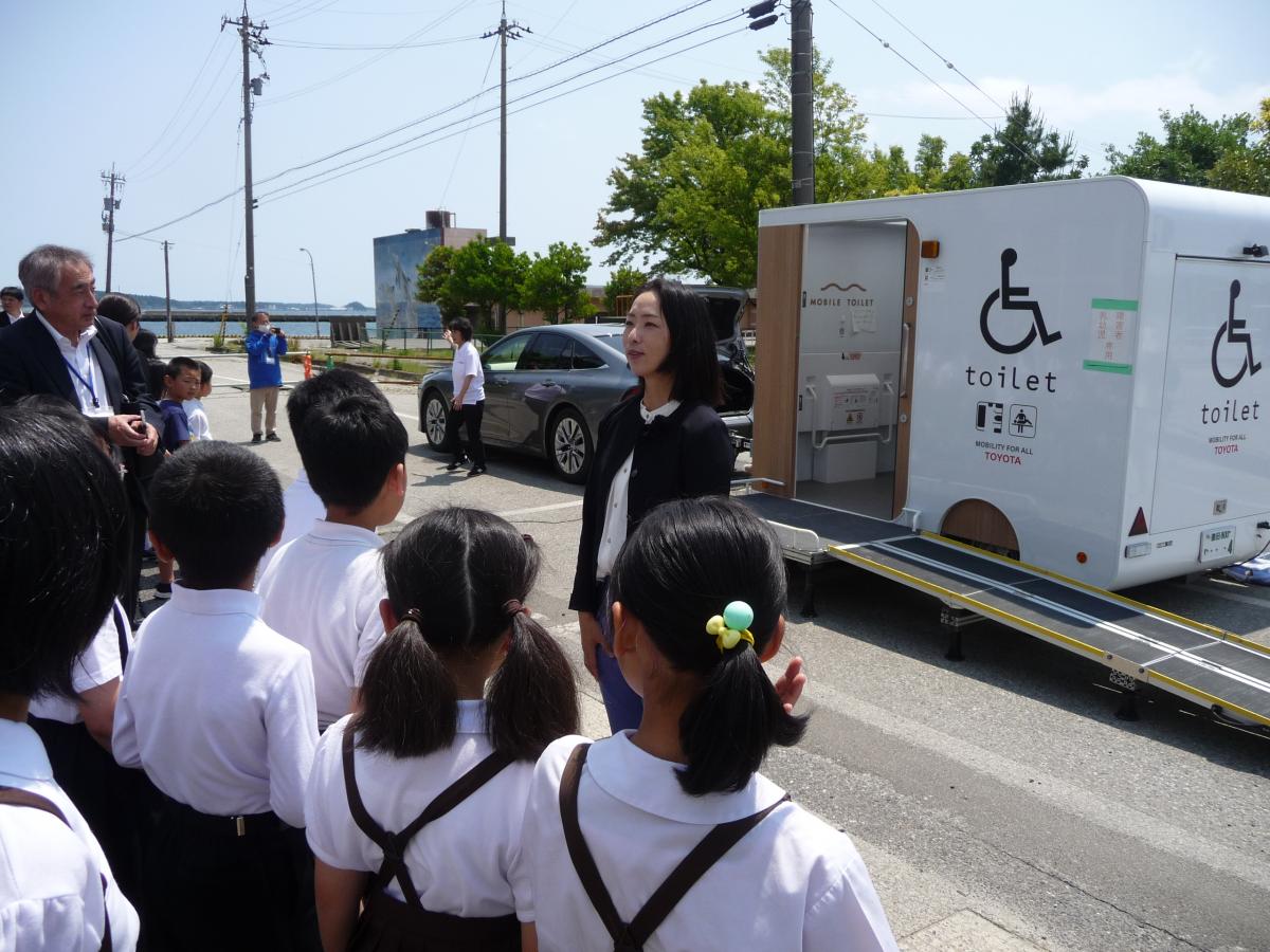 実際に、トヨタ自動車さんが作られている、車両MIRAIや、市内の学校で使われいるモバイルトイレをラポルトすずまで運んできてくださいました。また、FCEV(燃料電池車)等についても説明してくださいました。