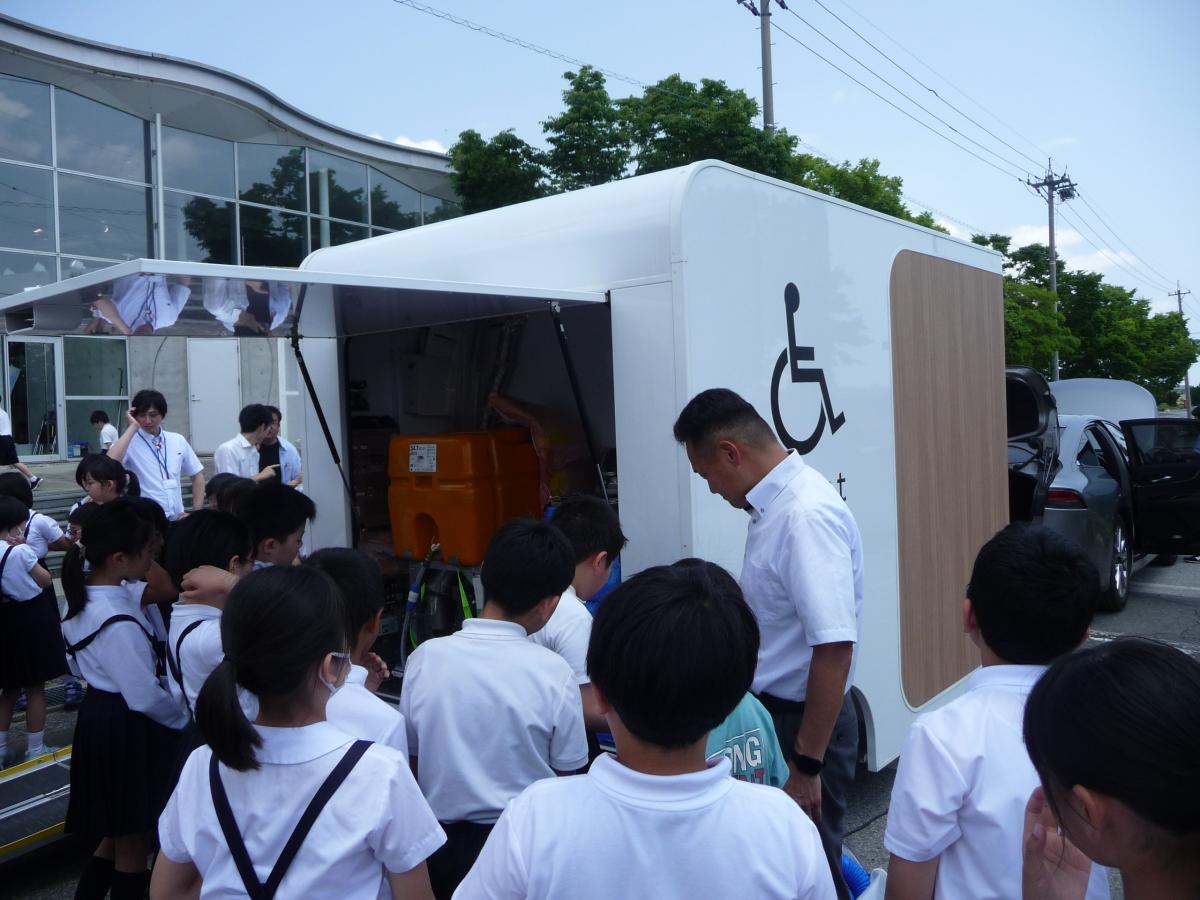 今まで飯田小学校で使用されていたトイレカーが本校駐車場に設置されました。現在使用中のトイレカー等不都合があった場合、児童及び職員のみで使用予定です。あわせてお菓子もいただきました。