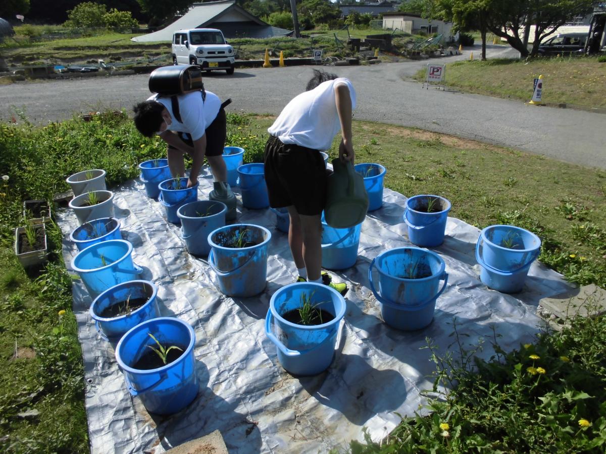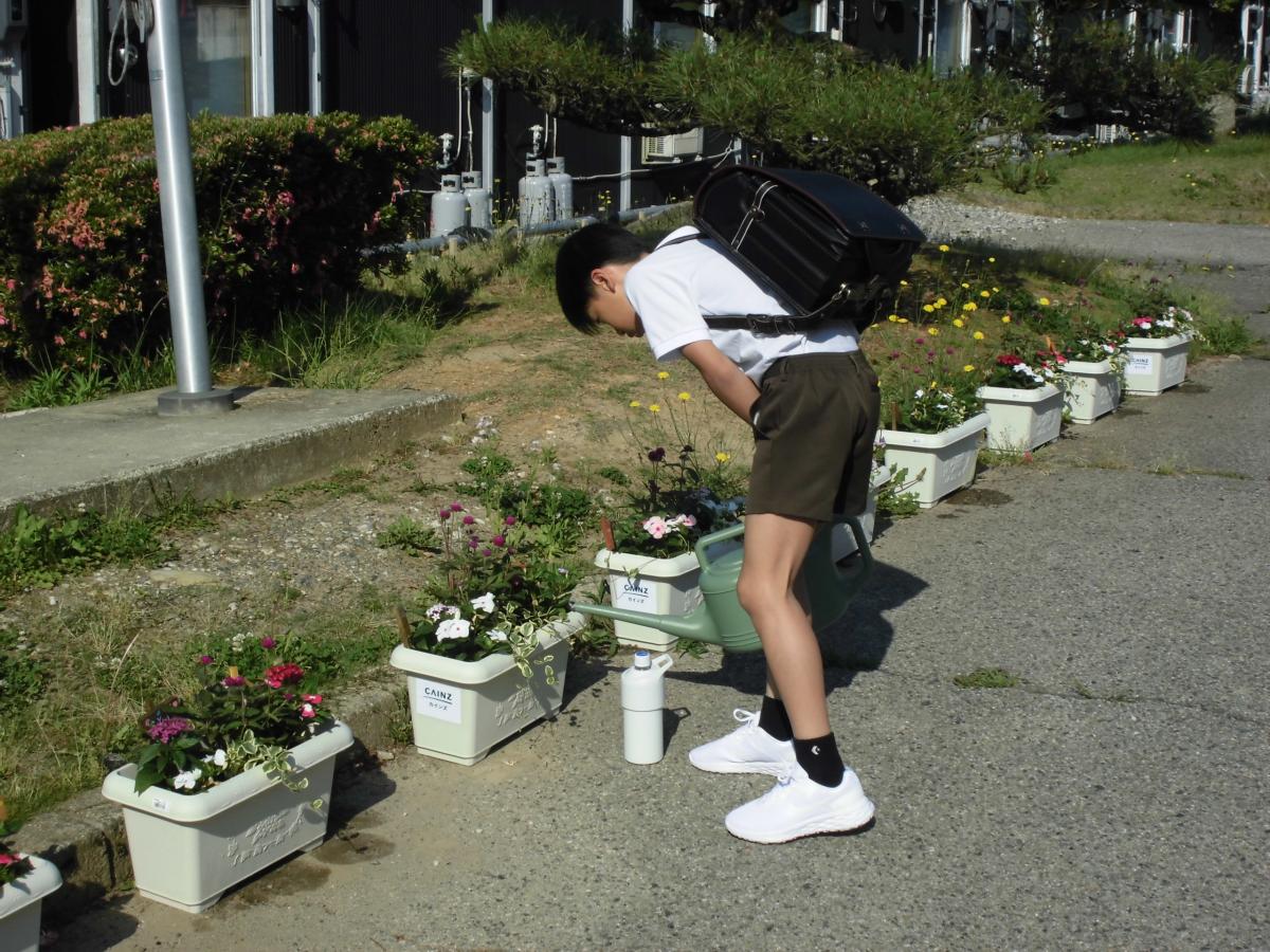 12日(水)、今朝は朝から良い天気、暑くなるとの予報もあります。子どもたちは朝から、バケツ稲、寄せ植え、種をまいたプランターの水やりに取り組んでいます。朝からやる気まんまんの児童の姿から、今日もたくさんの元気をもらいました。
