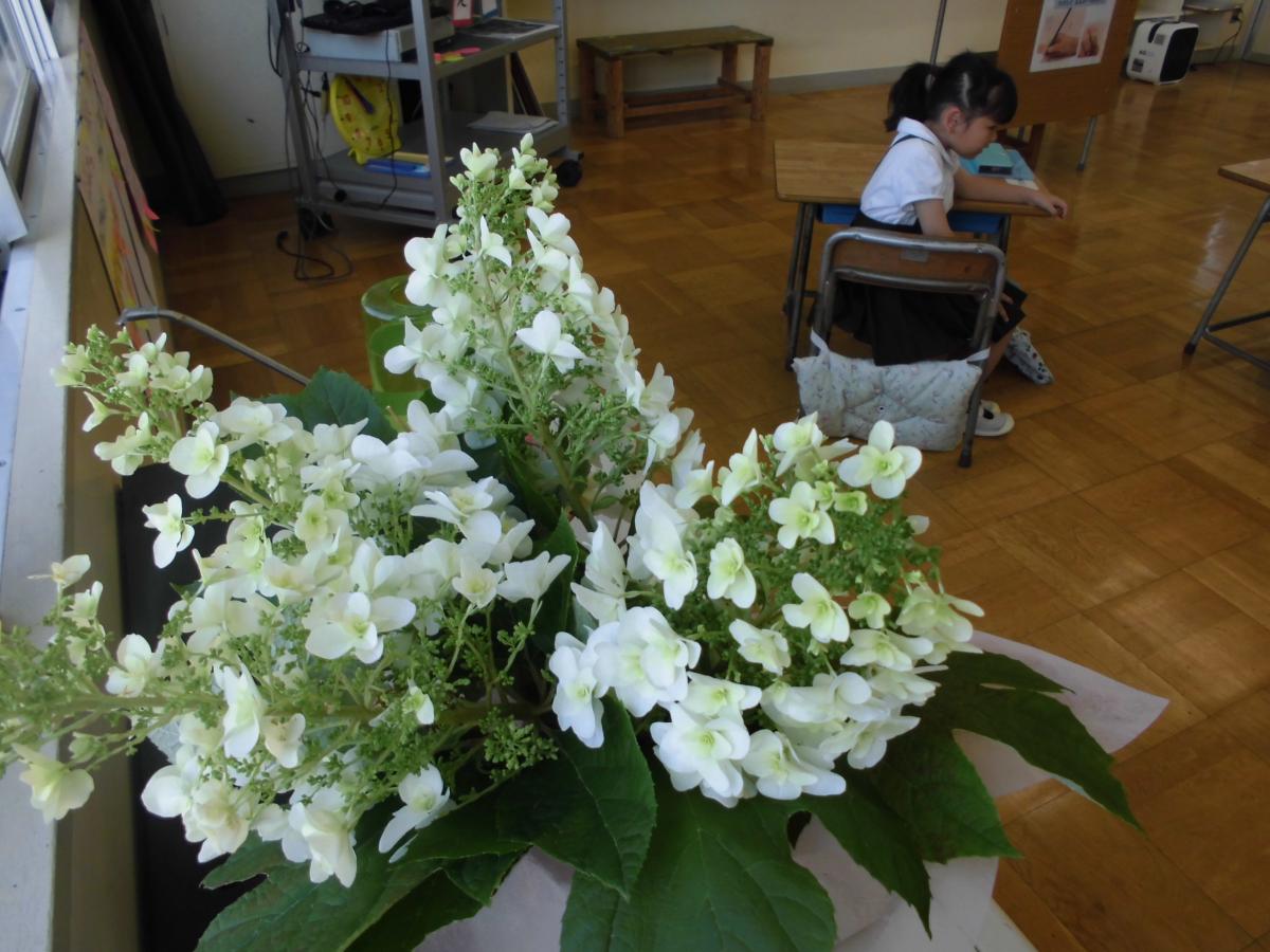 教室をのぞくと、教室の中にもお花がある教室もありました。1・2年教室は、今朝2年生が持ってきてくれた花がきれいに咲いていました。どの教室でも、朝から先生のお話をしっかり聞いたり、自分たちで意欲的に学んだりする姿が見られ今日もいい日になる予感がしました。