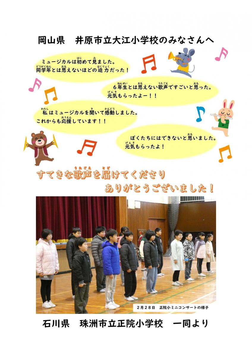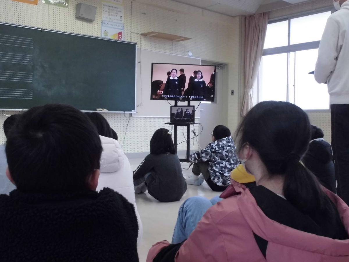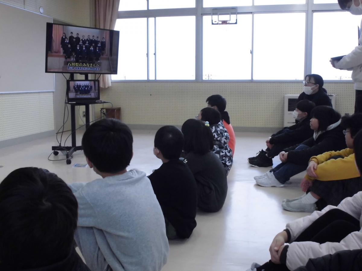委員会紹介の後は、学校に届いた応援メッセージの視聴です。今回は、岡山県の井原市立大江小学校6年生から届いたミュージカルでのメッセージでした。石川県の小中学校に送ってくれたもので、よく練習された約5分の素敵なミュージカル風メッセージでした。子ども達の感想を含めたお礼状をお届けする予定です。