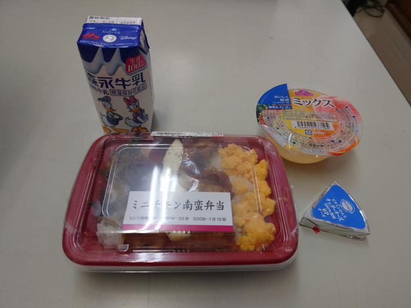 ミニチキン南蛮弁当、かぼちゃとウィンナーのスープ、ミックスゼリー、チーズ、牛乳です。