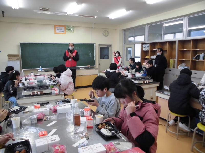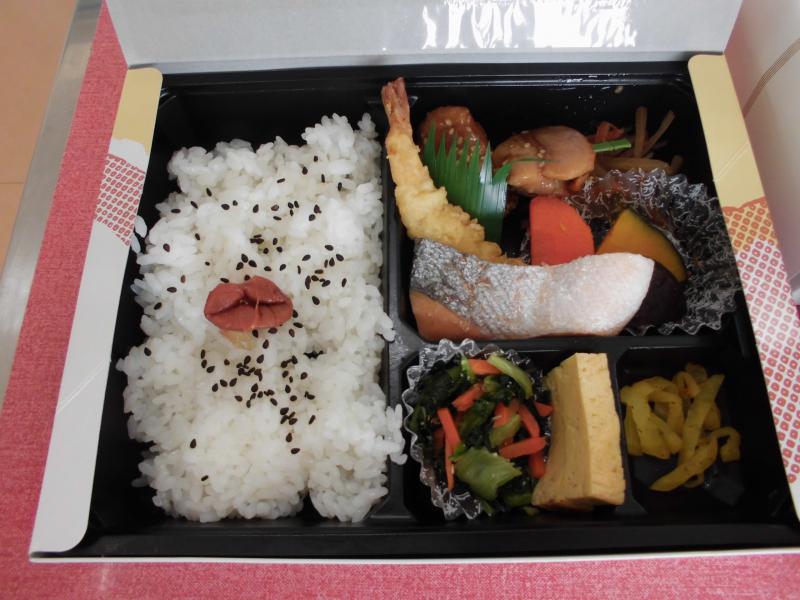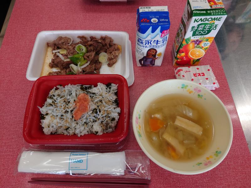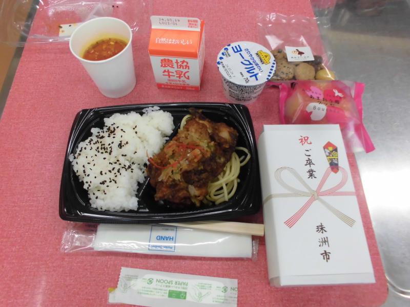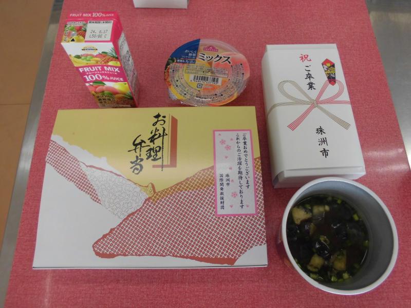 卒業祝い弁当、みそ汁、紅白饅頭、ゼリー、フルーツジュースでした。