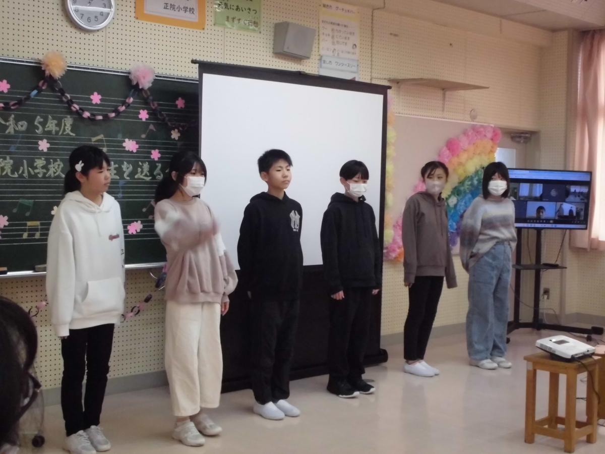 次は、6年生からのメッセージです。自らのクイズを交えて、卒業への思いを話してくれました。みんな笑顔で伝えてくれたことが印象的でした。続いて、校長先生からのお話です。今日は6年生全員が登校してくれ、多くの保護者のご参加もいただいて、約1時間楽しくて素敵な時間を過ごすことができました。【今確かだと言えること】は2つ。①今がもしかしたら人生で一番つらい時かもしれないが、未来は必ずよくなる一方であること。②大変な1年だったが、6年生は学校の中心として最後まで頑張ってくれたことで素敵な学校になったこと。本校の学校スローガンは『明日を夢見てすすんで学ぶ正院小学校』です。この歌詞にあるように、未来はいつだって始まったばかり。夢をもち、今を精一杯学ぶことこそ、皆さんの明日につながります。これからも1日1日を大切にして共に前へすすんでいきましょう。6名の卒業生の皆さん、ご卒業おめでとう。自分の夢を大切に、未来に幸多かれと祈っています。