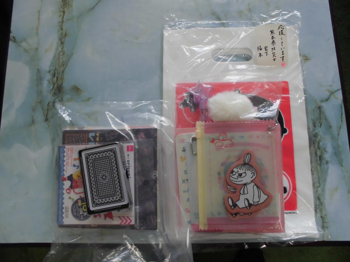 ⑥熊本県防災士 宮下様・福本様より…避難所の子どもたちに文房具や遊び道具をいただきました。後日、放課後学校で遊んでいる児童に配付予定です。