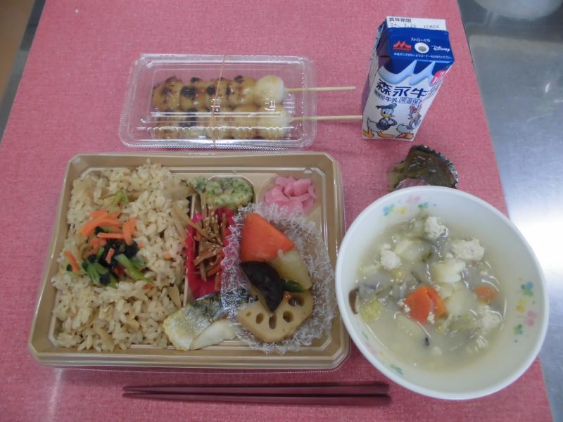 和風おかず弁当、けんちん汁、牛乳、ごへいもち/みたらしだんご、めかぶ、スイートポテト でした。