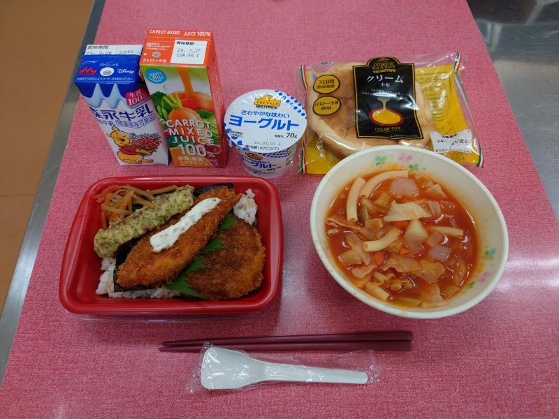 ミニのり弁当、ミネストローネ、パン、ヨーグルト、牛乳、野菜ジュースでした。
