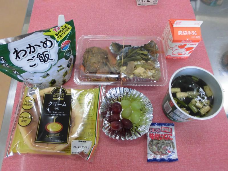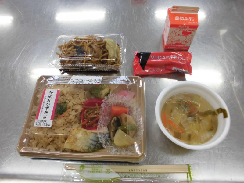 和風おかず弁当、焼きそば、野菜スープ、カステラ、牛乳でした。