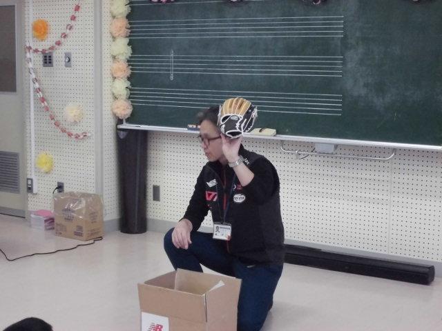 最後に、本日から来ていただいている震災・学校支援チーム「アース」の池本さんより一言ご挨拶をいただきました。今週もお世話になります。よろしくお願いいたします。最後に、子どもたちに素敵なプレゼントが。あの大谷翔平選手からのグローブが届きました。昼休みに時間があればぜひ使って下さいと紹介しました。