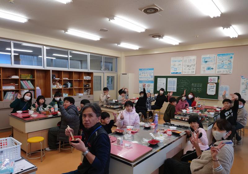 お弁当はミニサイズだったのでペロリと平らげ、時間内に食べ終えた児童がたくさんいました。三崎中学校からはすき焼き風煮が届きました。温かくて、美味しかったです。おかわりする児童もいました。