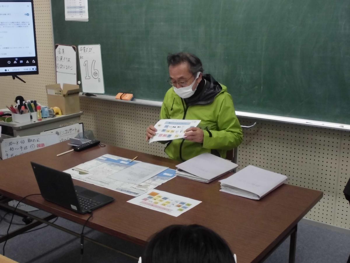 本来なら、6年生は地域の方にとってもっとわかりやすいハザードマップづくりに取り組んできたのですが、今回の地震を受け、多くの避難場所も被害がありました。学校裏の殿山も山頂が崩落しており、今後の防災時の避難場所も再考が必要であることもお話されて、でも途中まで作っていた6年生のハザードマップを見て、「よいものを作ったね。」とほめていただき、子どもたちも嬉しそうでした。