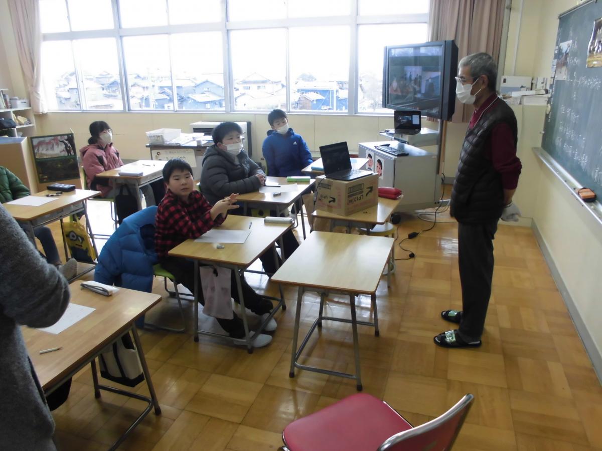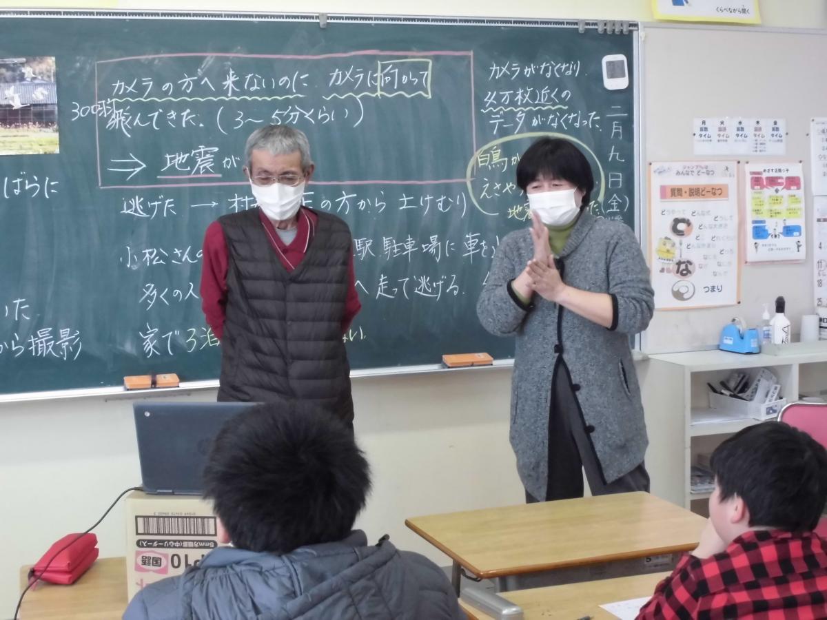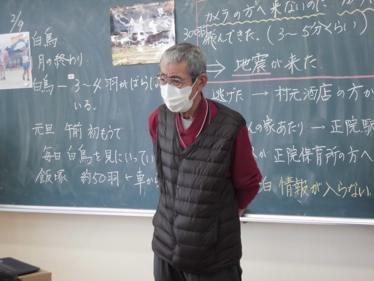 その殿山会のメンバーである濱木さんが、実は1月1日、あの日にハクチョウを観察していたことを知り、ぜひその時の様子を聞いてみたいとのことになり、本日の来校となりました。一番心に残ったのは、あの地震が起こる数分前に、たくさんいたハクチョウたち全てが、いつもは自分におしりを向けて飛び立つのに、自分の方に向かって飛び立っていったとのこと。その後、あの地震が起こったこと。その時の濱木さんの行動も教えていただきました。残念ながらその時撮影したカメラは今取り出せない状態で、もし手に入ったら見せてもらう約束をしました。