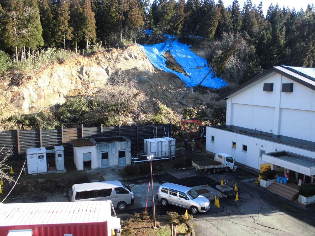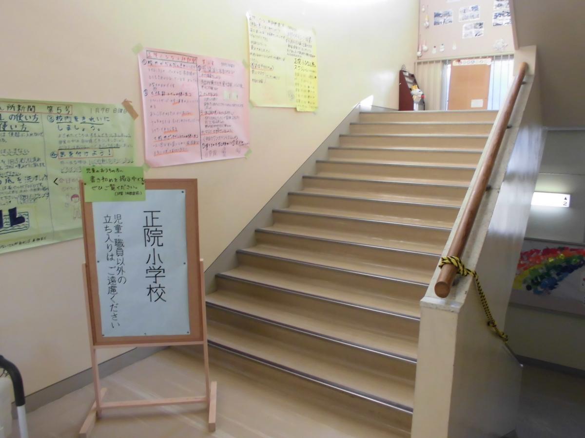 今朝は、児童集会です。会場の3階音楽室に向かう途中、すてきなものにたくさん出会いました。階段踊り場では、合同図工の作品が展示されています。朝から元気がもらえた場面でした。2階から上の階段から、学校エリアにしました。避難者と皆さんと共に過ごしやすい学校になるために。3階廊下からは、体育館裏で土砂を取り除く工事が始まりました。少しずつ元どおり、それが現実に確実に動いています。