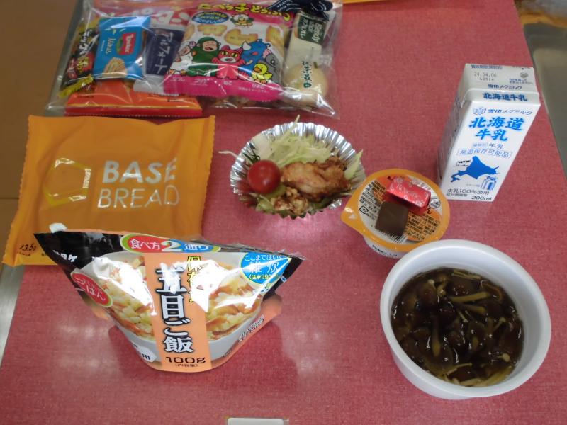五目ごはん、きのこ汁、唐揚げ、サラダ、パン(メープル味)、牛乳、みかんゼリーでした。