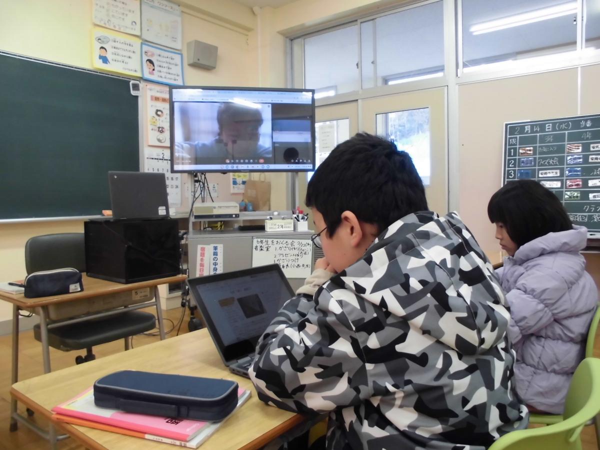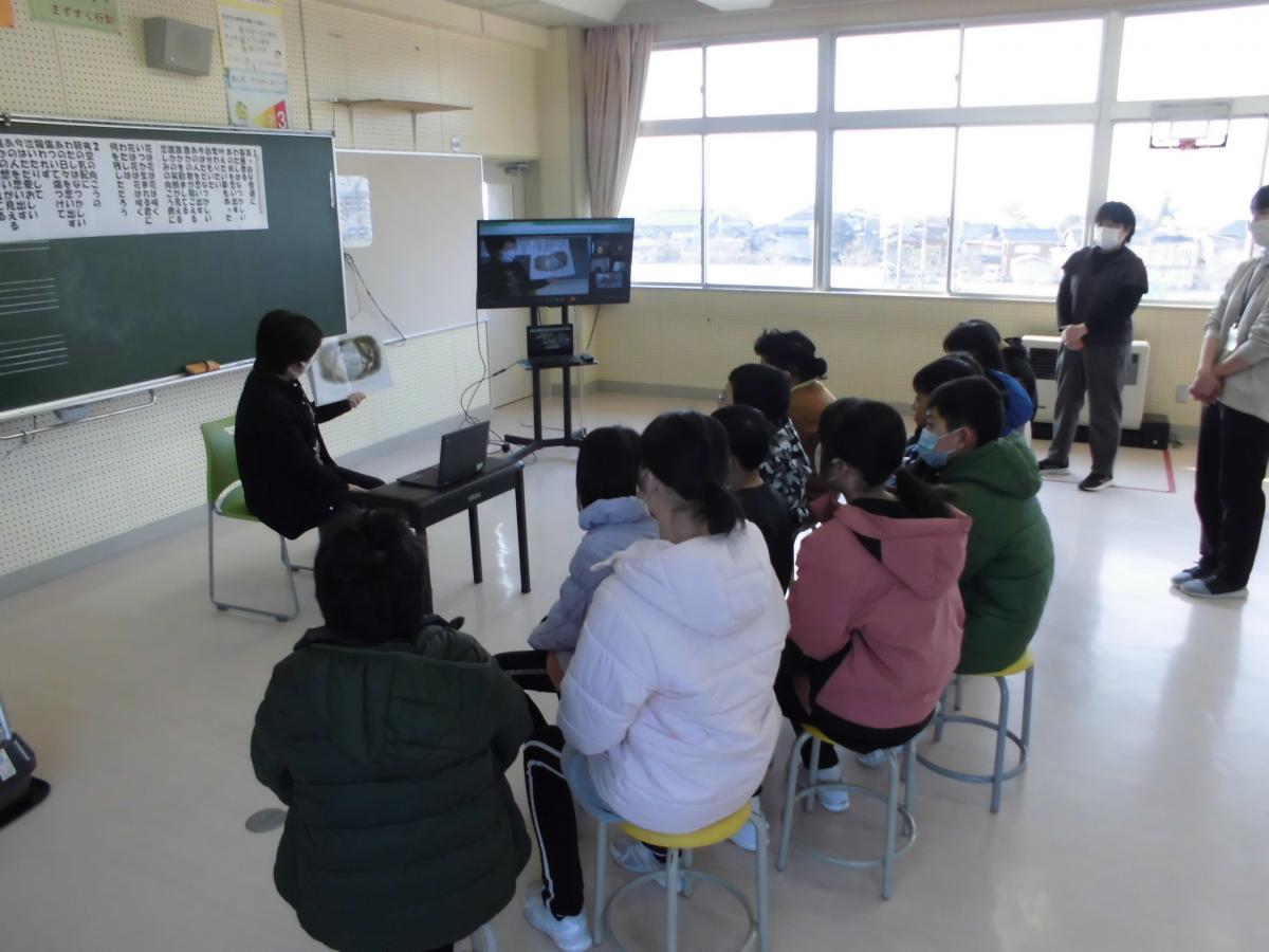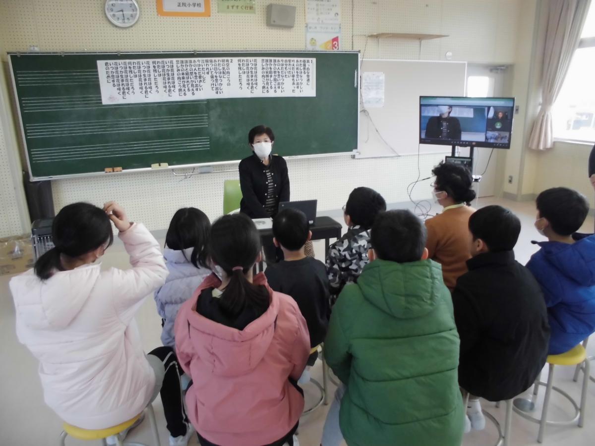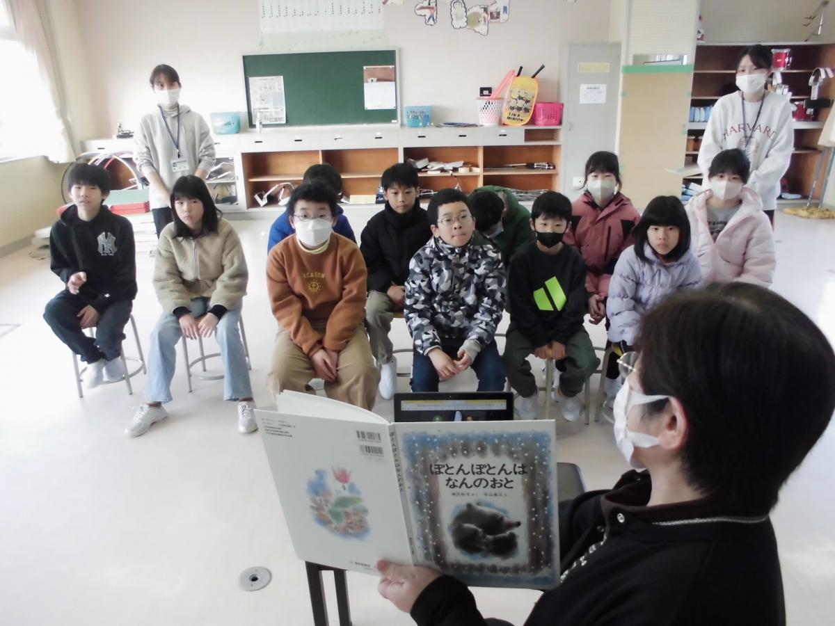 14日(火)の朝、今日は月に一度の朝の読み聞かせの日です。地震後も、1月から予定通りご来校いただいており本当に感謝です。今日は登校児童全員+オンラインの子も交えて、音楽室での読み聞かせでした。今日は2冊の本を読んでくださいました。
