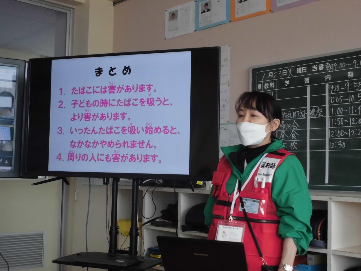 地震前から今日を予定していた5・6年の薬物乱用防止教室。学校再開後、職員と共有していることは「予定していたことは、できるだけ予定通りに!」。講師をお願いしていた本校薬剤師さんが珠洲を離れ避難されているため、石川県薬剤師会の方が来校された際お願いしてみたところ、本会の副会長で珠洲市出身の橋本昌子さんにご来校いただき、予定通り本日開催できることとなりました。