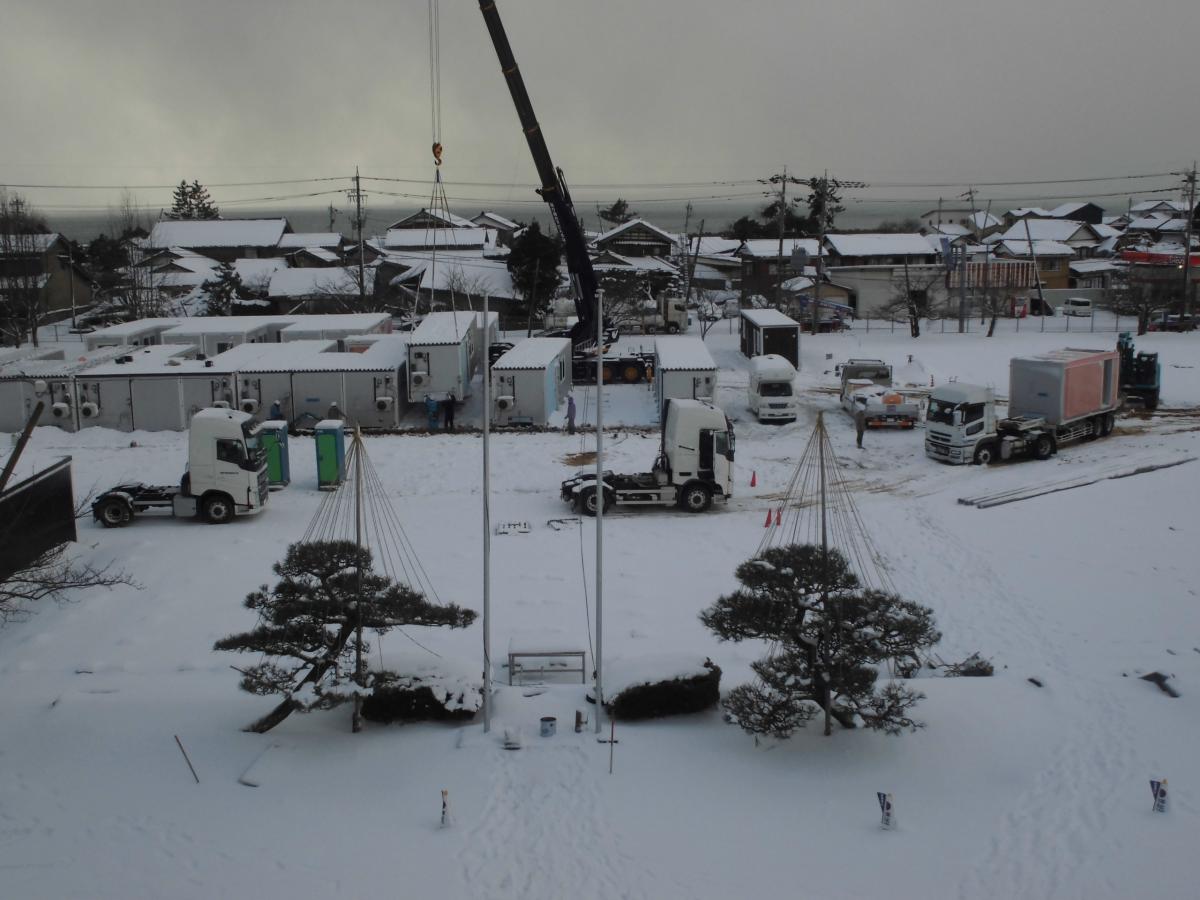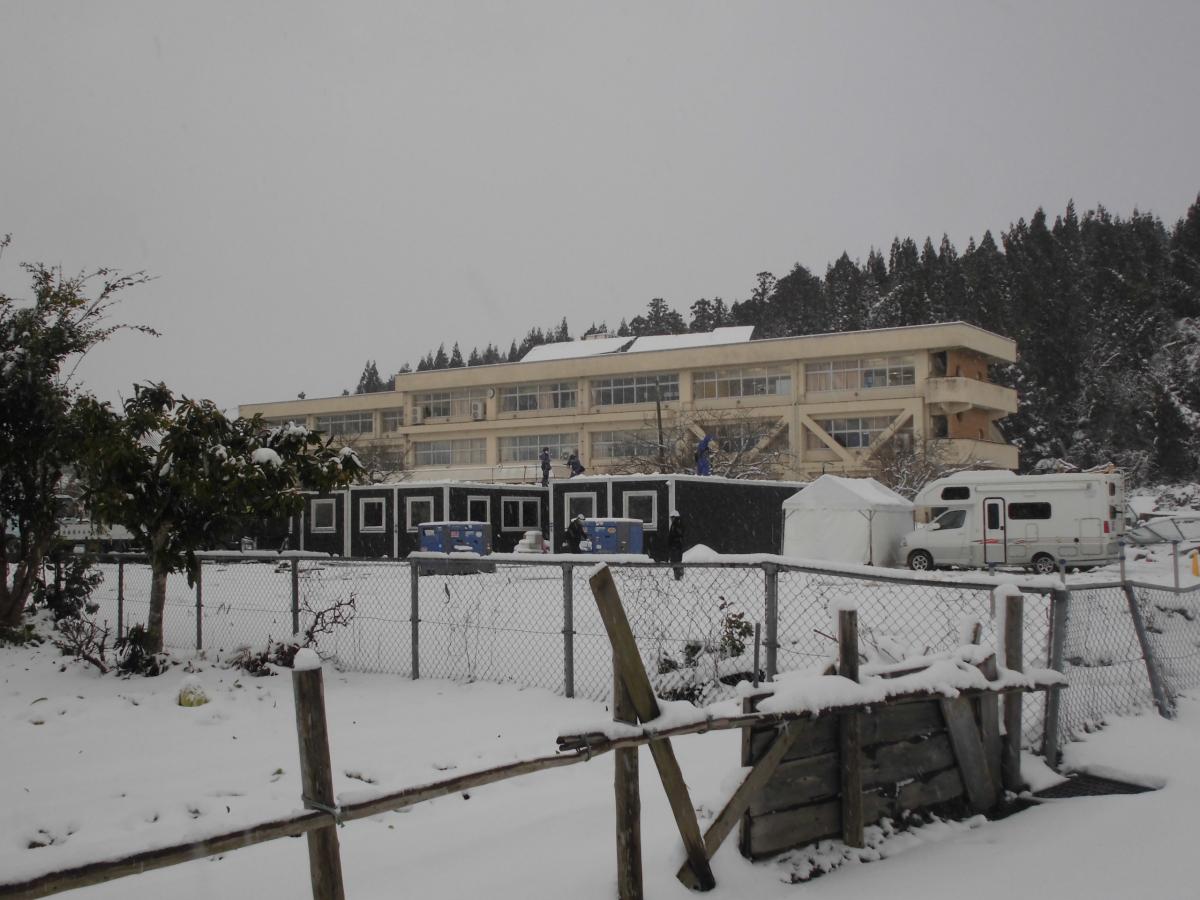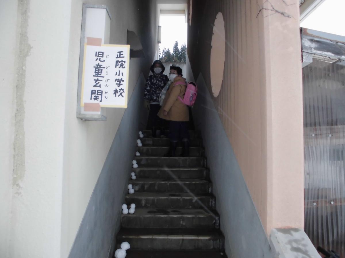 25日(木)、学校再開2週目も半ばを過ぎました。それでも、子どもたちは元気に登校してくれました。学校入口の非常階段には、避難所にいる児童がミニ雪だるまをつくり、子どもたちの登校と応援してくれていました。また、避難所にいる児童は自分の生活リズムができてきたようで、8時30分前から教室に来る児童も。今日も明るい太陽の光が子どもたちを出迎えてくれました。仮設住宅工事も順調のようで、雪の中で精一杯努力される姿を見て本当に頭が下がる思いです。