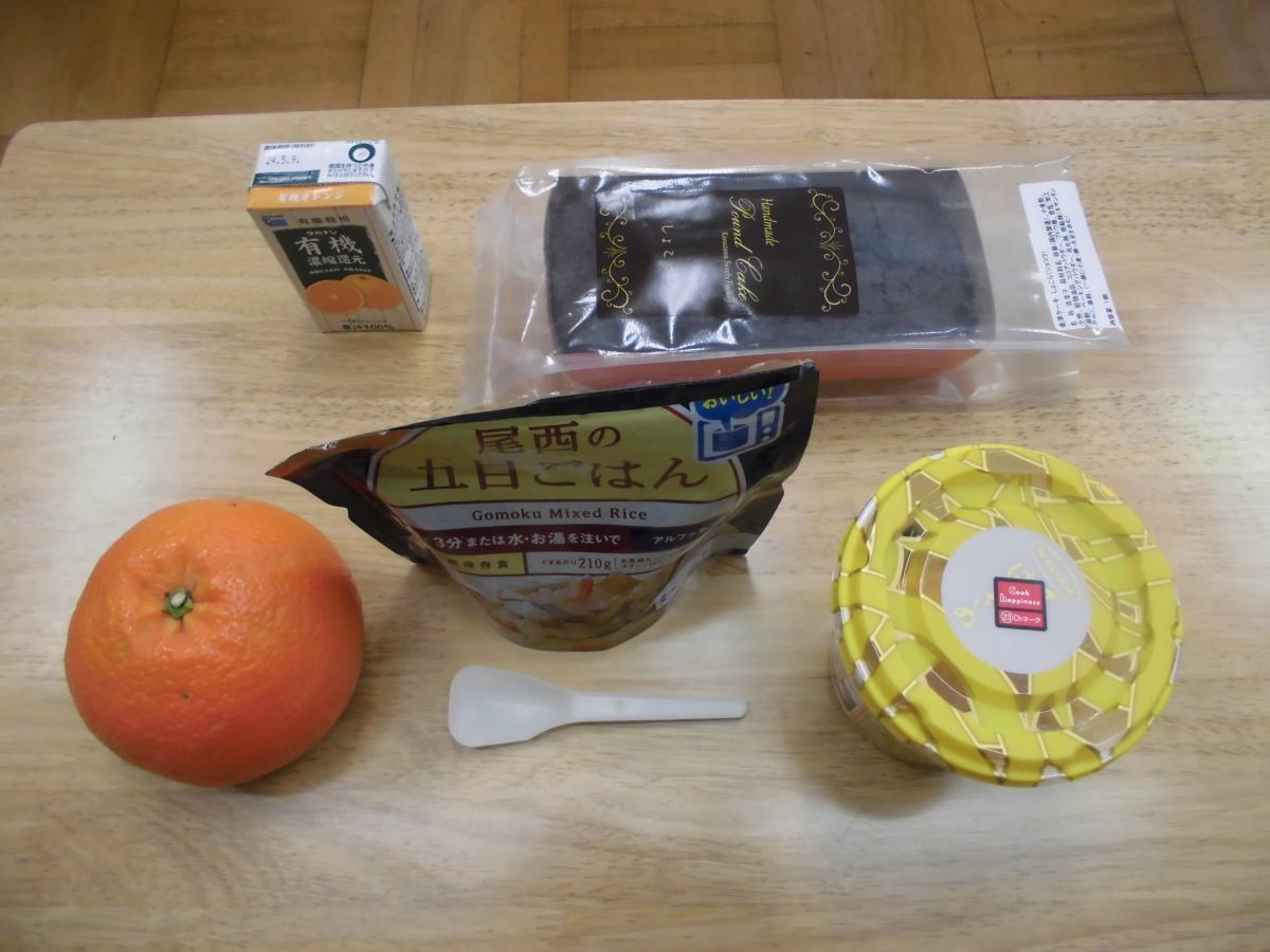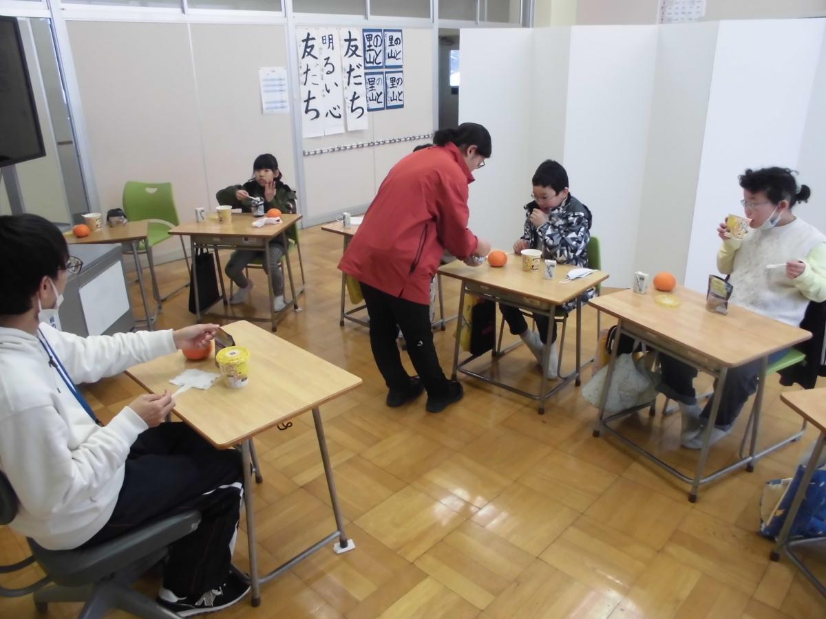 24日(水)の昼食は、山菜ごはん、かきたまスープ、伊予柑、オレンジジュース、チョコレートケーキでした。みんなだんだん食べ方も上手になってきたようで、残さずきれいに食べていました。
