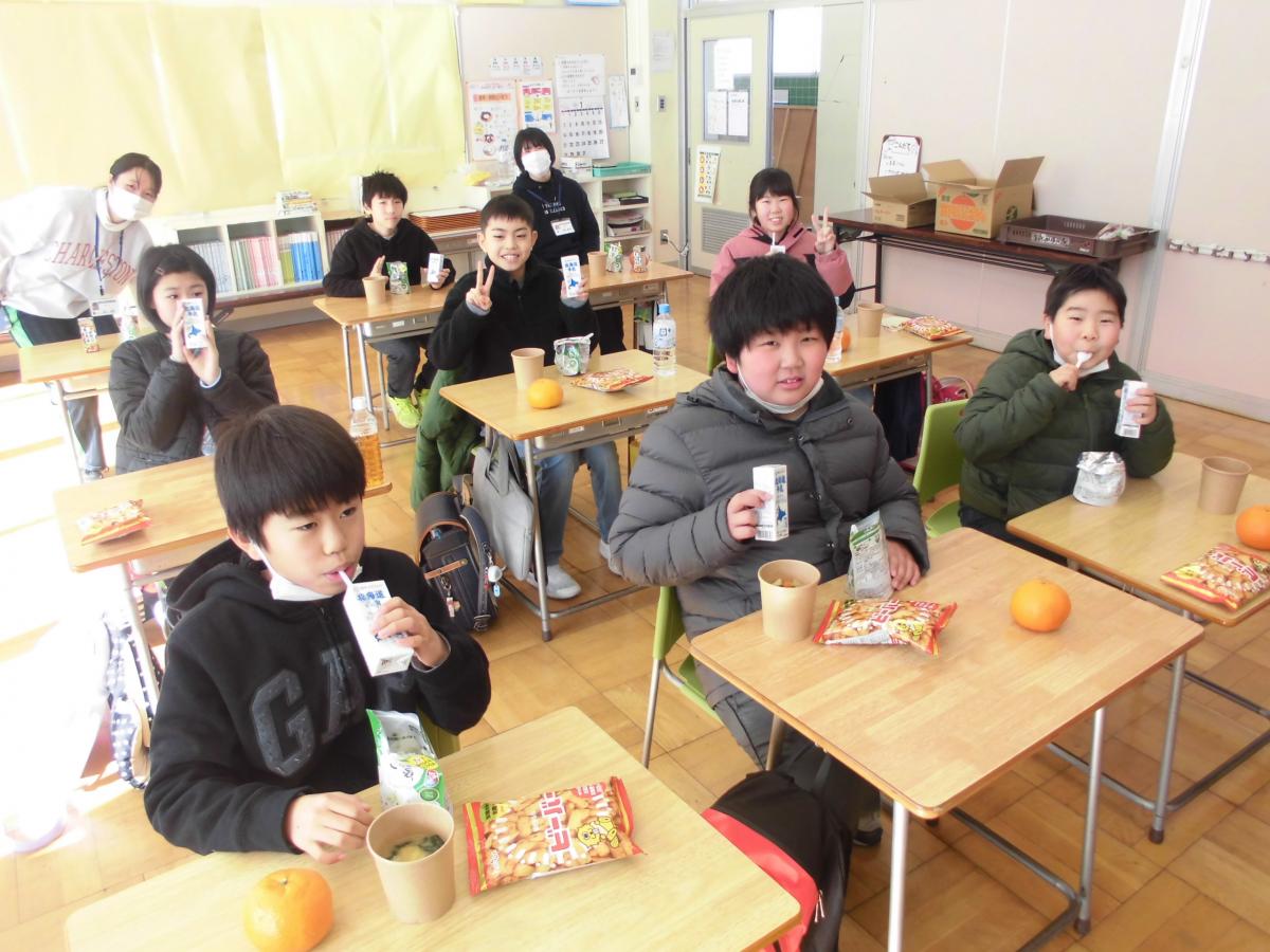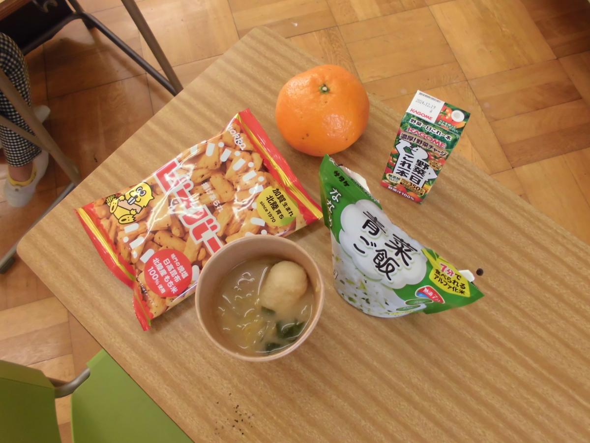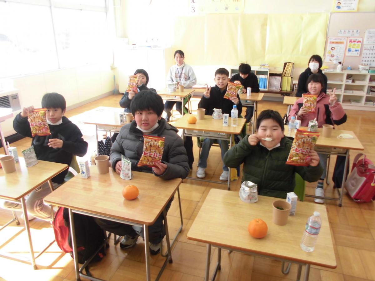 今日の昼食は、青菜ごはん、きりたんぽ汁、牛乳、伊予柑、ビーバー(持ち帰り)です。牛乳は宇都宮さんからの差し入れ、ビーバーは建築会社に勤める校長の弟からの差し入れです。みなさん、子どもたちのために様々な心遣い、本当にありがとうございます。子どもたちは、今日ももりもりと食べる様子が見られ、これも一安心です。