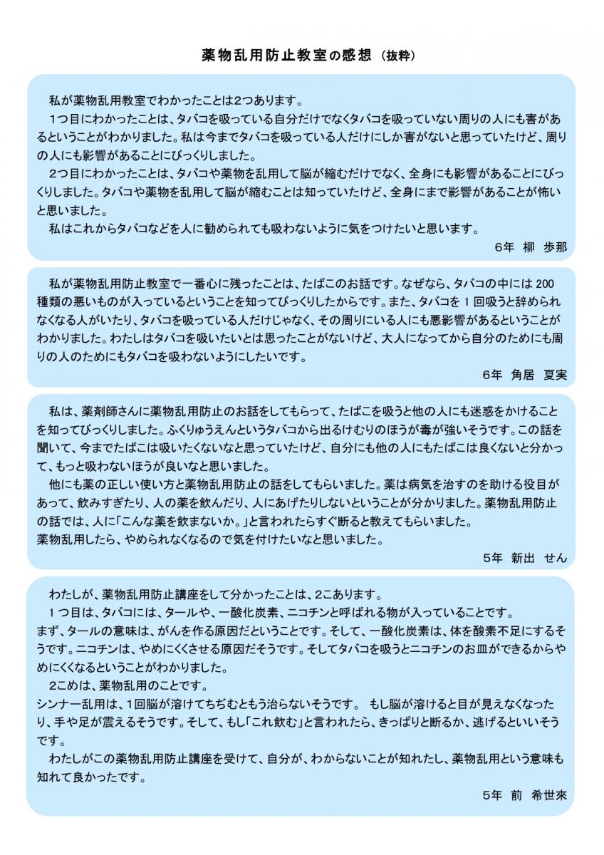 橋本さんは、プレゼンを用いて、次の3つ【①たばこの害②薬の正しい使い方③薬物乱用の怖さ】についてお話いただきました。5・6年生のみんなは、なんとなく知っていたことでも、改めてお話を聴くと、やっぱりダメなものはダメだということ、きっぱり断ることの大切さを学んでいたようです。特に「薬物をすすめられた時の断り方」については、実際にどのように話せば断れるのか、勇気をもってきっぱり伝えることの大切さを感じていたようです。