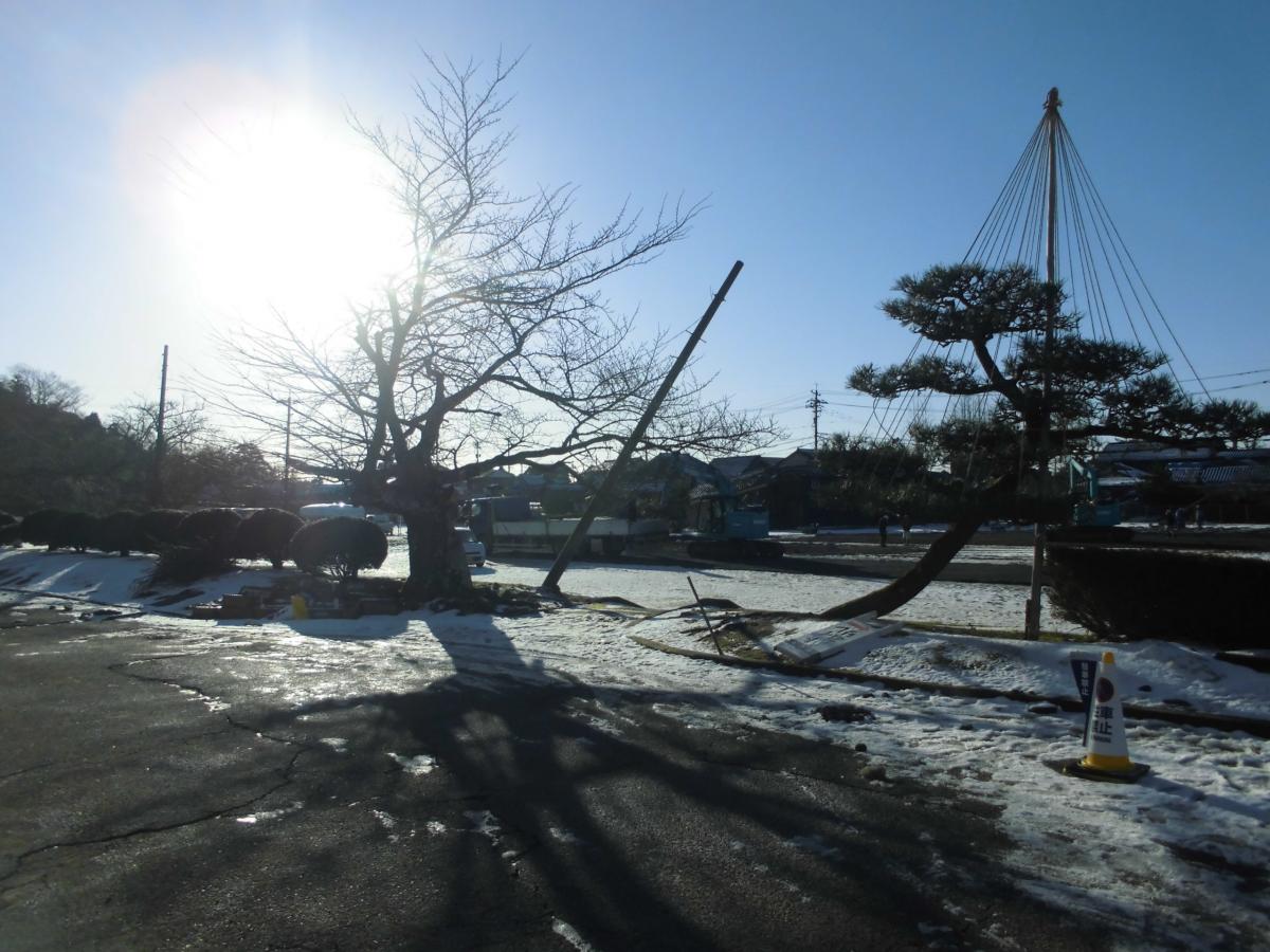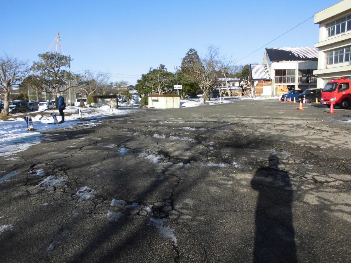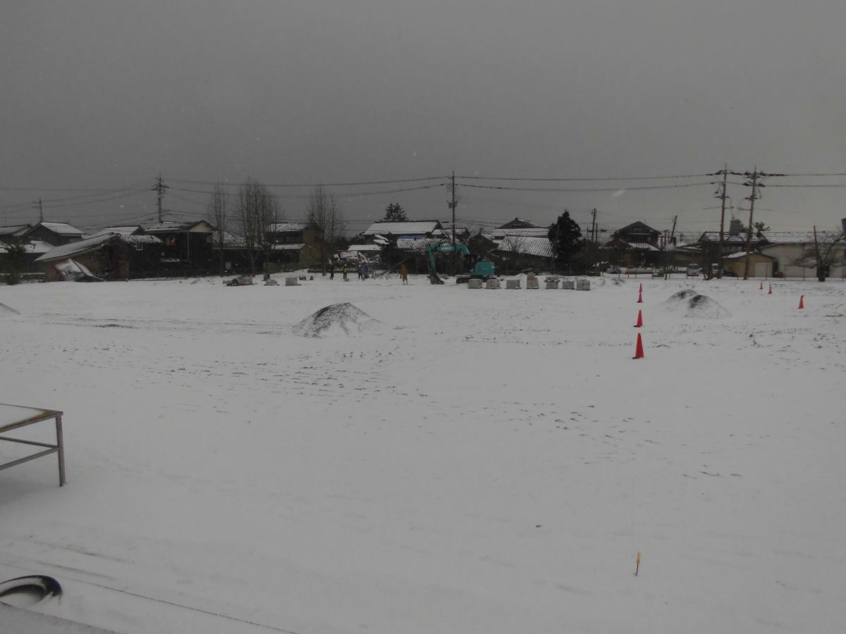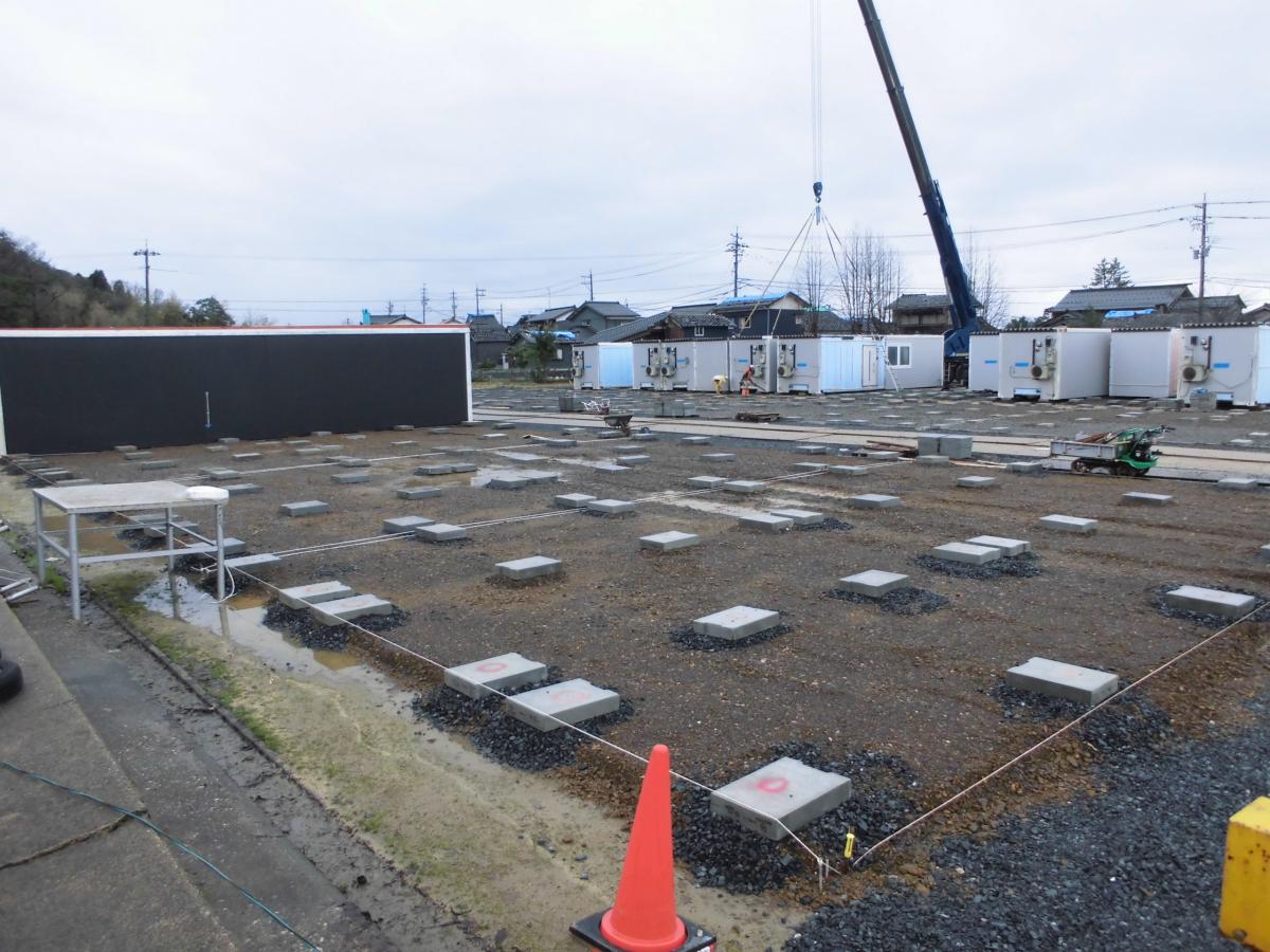16日(火)、学校を再開して2日目です。今日は朝から冷える1日でした。学校周辺は真っ白、時折吹く風で芯から冷えそうな日となりました。そんな中、運動場では仮設住宅の建設も本格的に始まっているようでした。