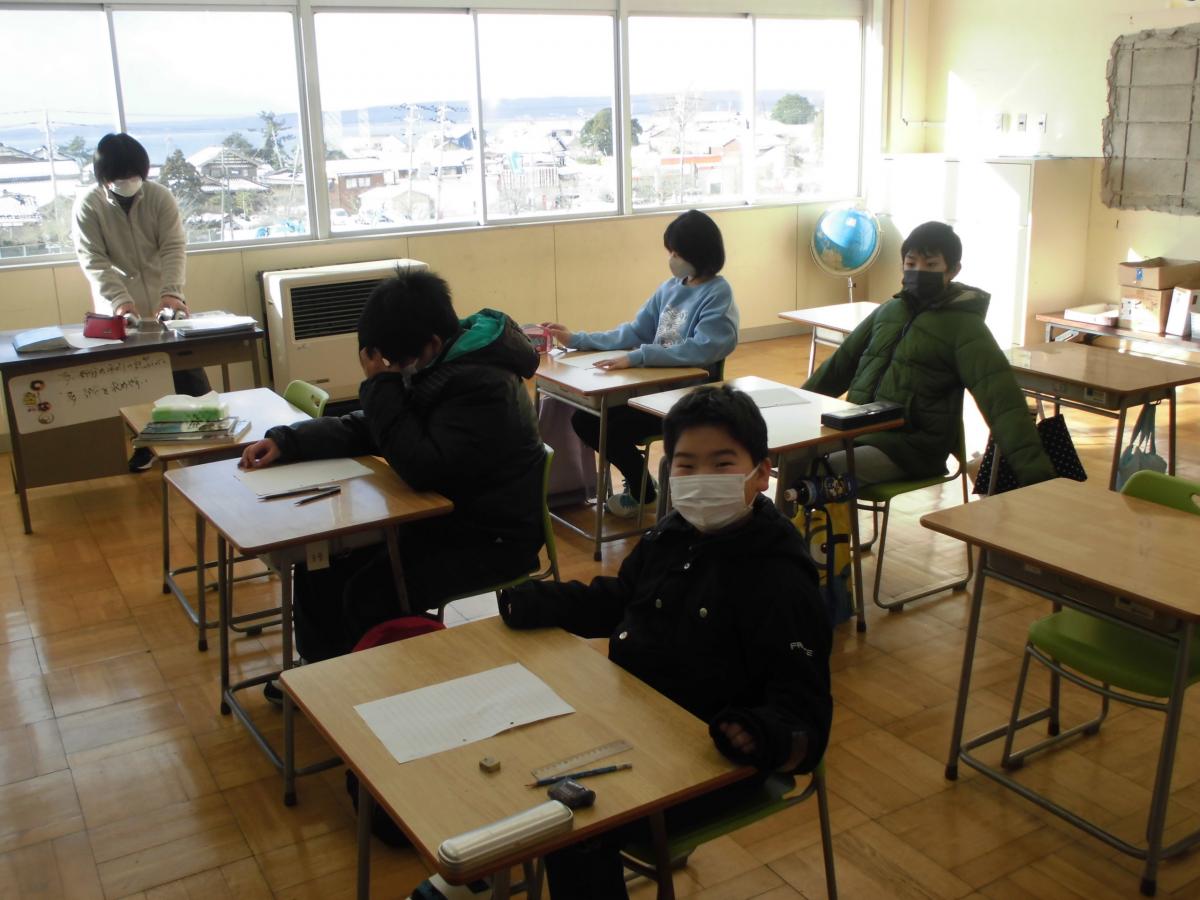 さて1限目です。4年生は国語「漢字」の学習です。教科書に示された漢字について意味を確認したり、漢字を使った文を書いたりしていました。3年生も国語「2学期までのまとめテスト」です。集中して取り組む姿が見られました。5年生は社会「自然災害から人々を守る」、今の珠洲の状況から今学ぶべきことを、給水車をもとに考えていました。1年生は国語「たぬきの糸車」です。登場人物の気持ちを想像して考えていました。6年生は国語「メディアと人間社会」、6年間の説明文の学習のまとめであること、説明文について学んだことを振り返っていました。
