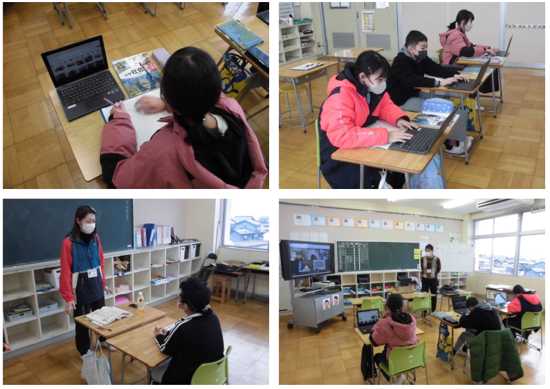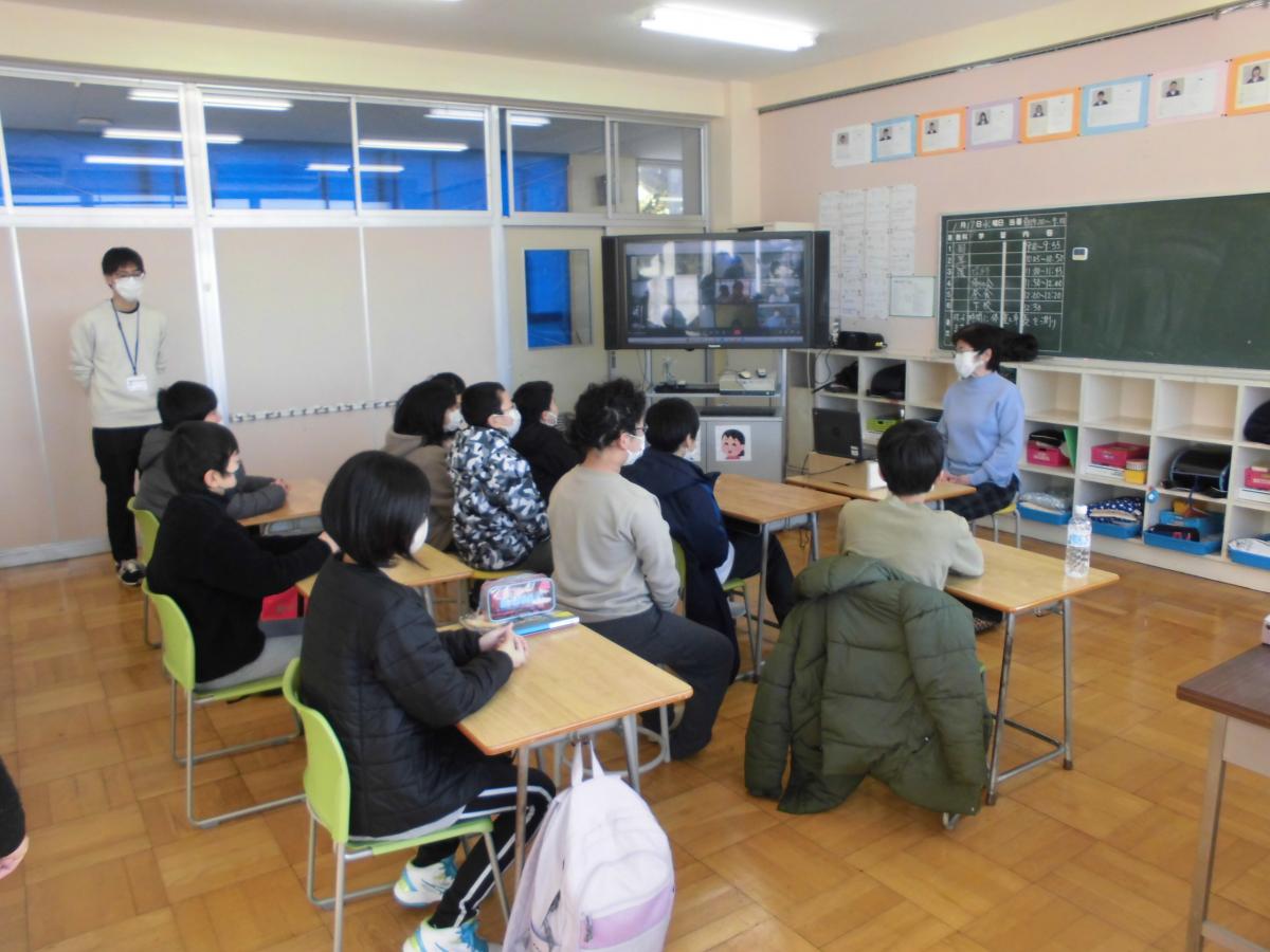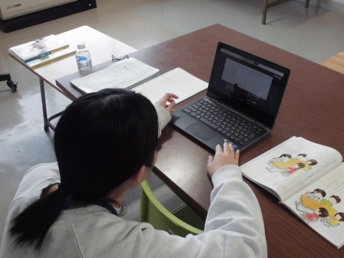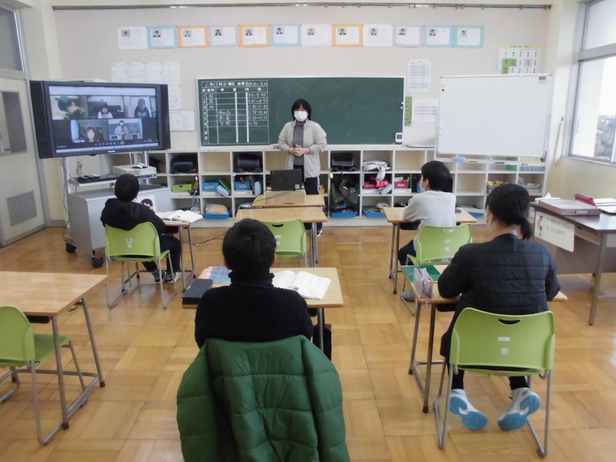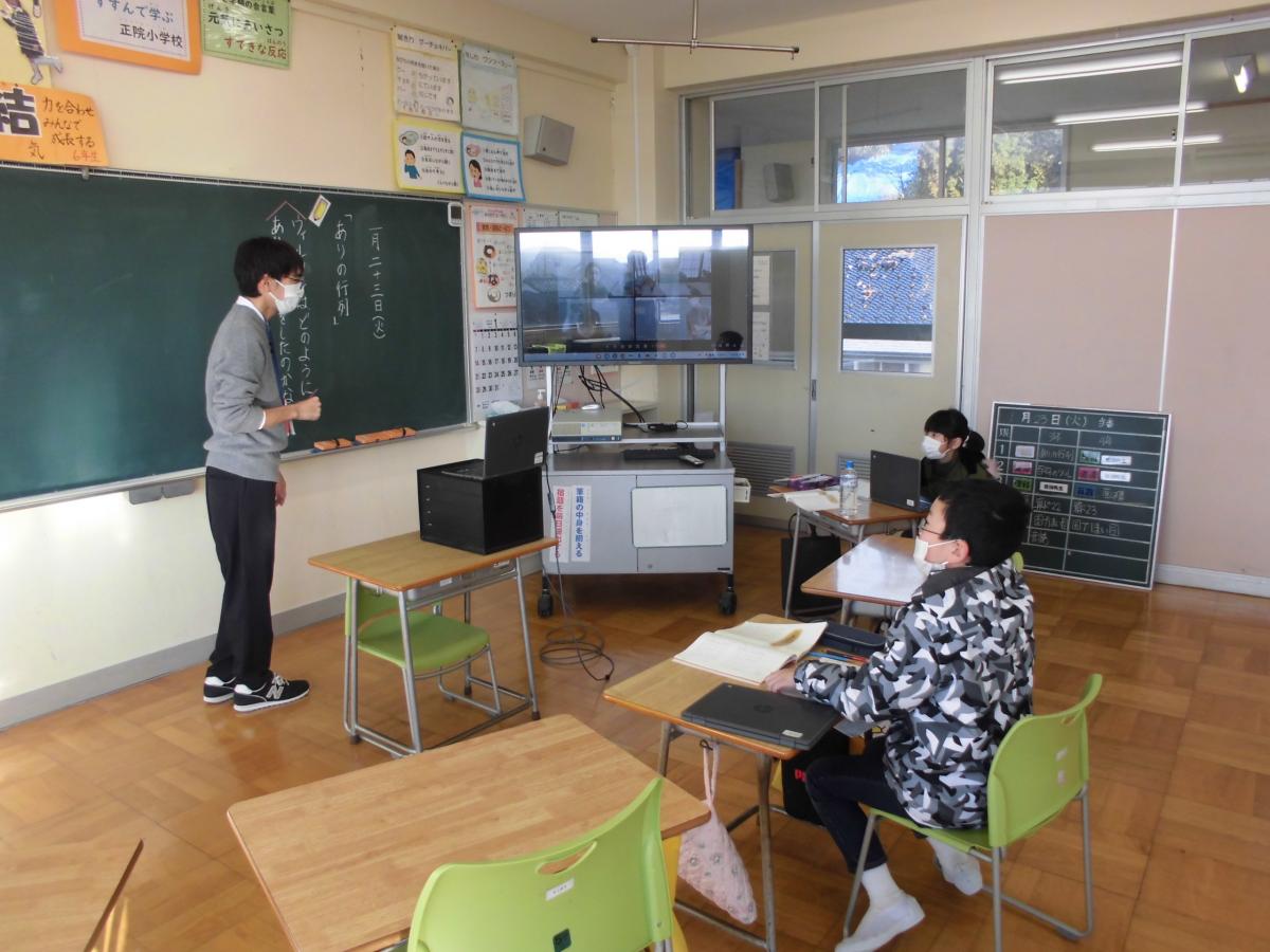 その後1限めの授業が始まりました。4年生は国語:熟語について、5年生は国語:漢詩について、6年生は算数:小数の混じった計算の立式について学んでいました。5年生は登校とオンラインが半々、6年生は登校1名、他はオンラインですが、各担任は慣れてきた様子で、うまく画面の角度を変えながら学習をすすめていました。