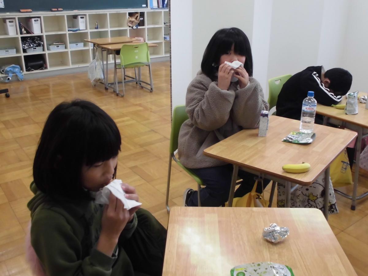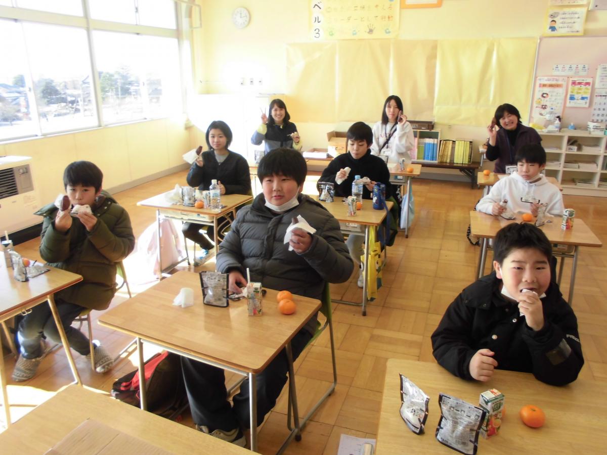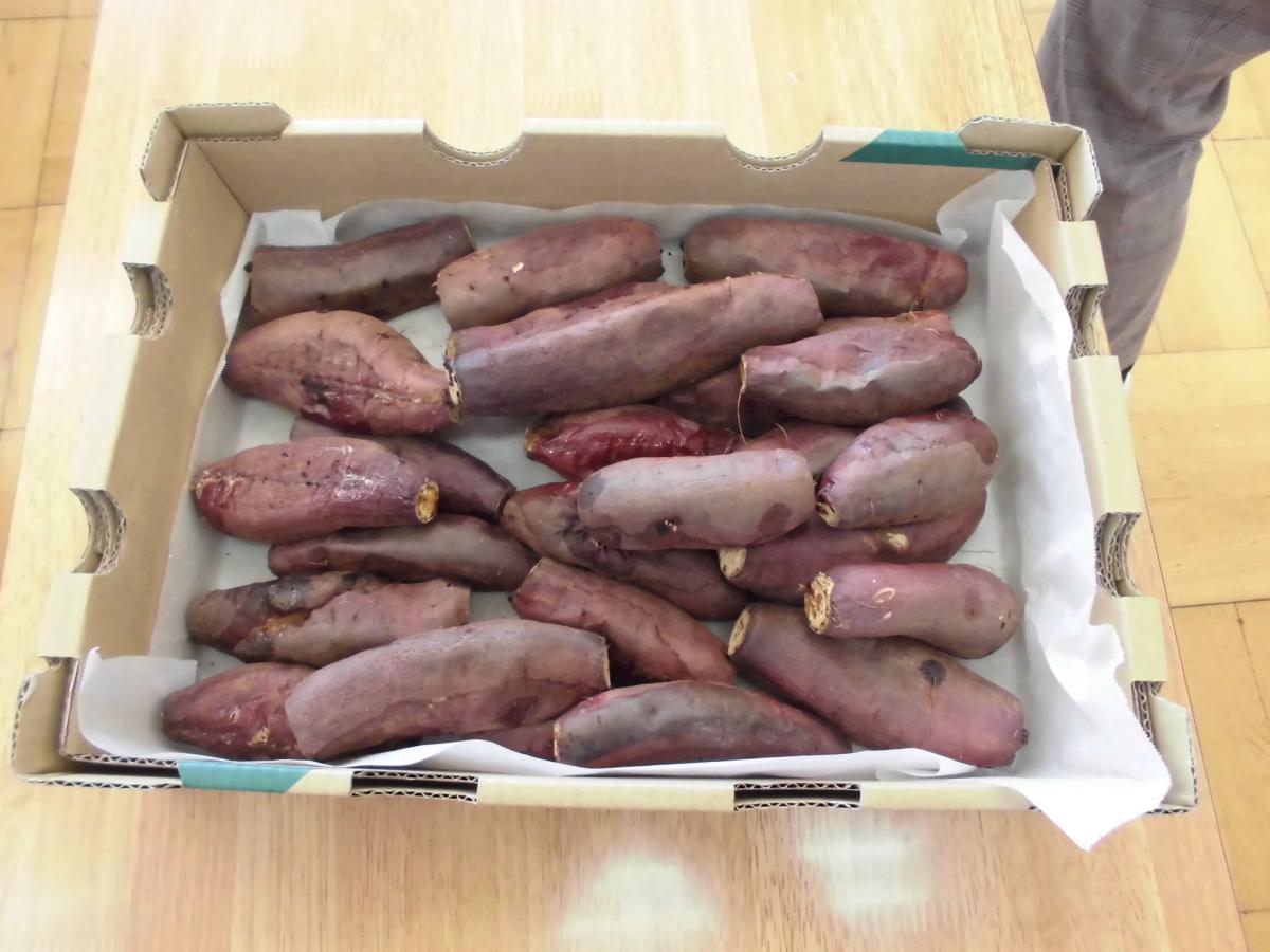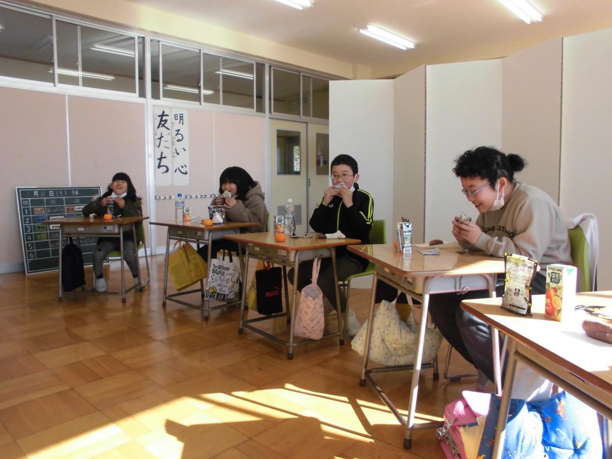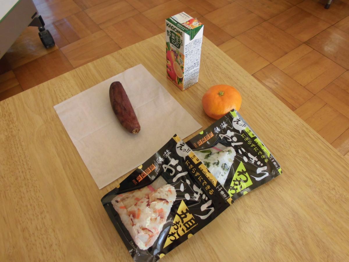今朝、自宅近くの避難所で生活している皆口さんの保護者の方から、子どもたちに甘ーい焼き芋のプレゼントがありました。朝、熱々が届いたのですが、授業もあり、昼食時に温め直して出すことに。今日の昼食は、アルファ米おにぎりと焼き芋、みかんと野菜ジュースでした。子どもたちはパクパクと全員完食!特に焼き芋は蜜が入っていて本当に美味しかったです。