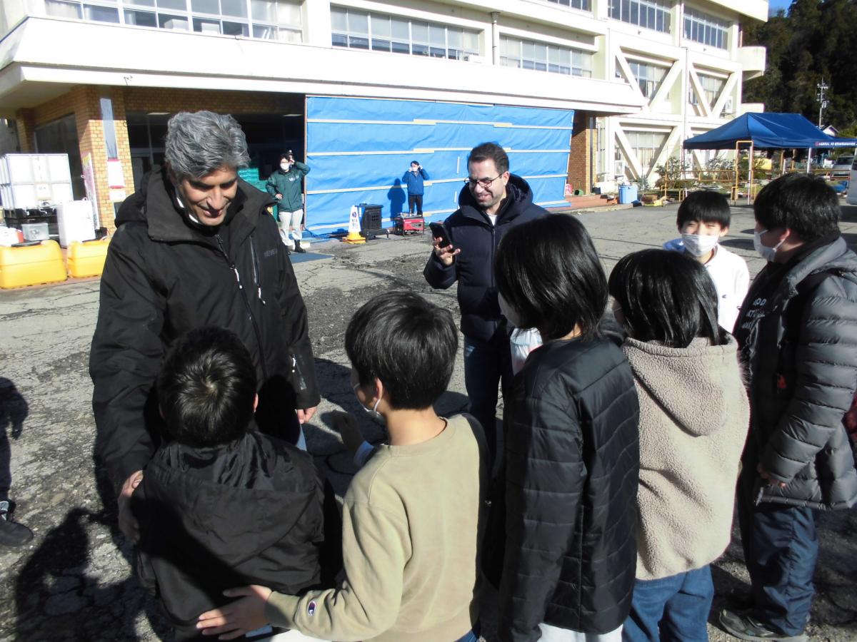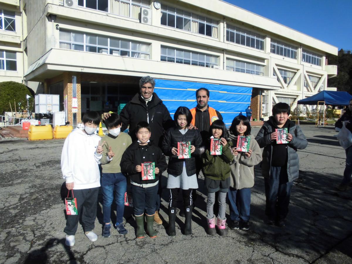 17日午後、午前中の授業を終え、午後からは避難所本部が職員室から別室へ移動することになり、職員は職員室の現状復帰作業を行っていました。そこへ、ある保護者の方から「校長先生!」との呼び出しが。行ってみると、クエートの大使館から大使が避難所の子どもたちへ激励に来られたとのこと。すぐ校内放送で子どもたちを集めると、大使から直接一人一人に挨拶とプレゼントをいただきました。子どもたちは嬉しそうに英語で会話し、プレゼントをいただいていました。