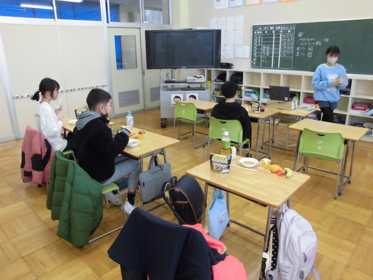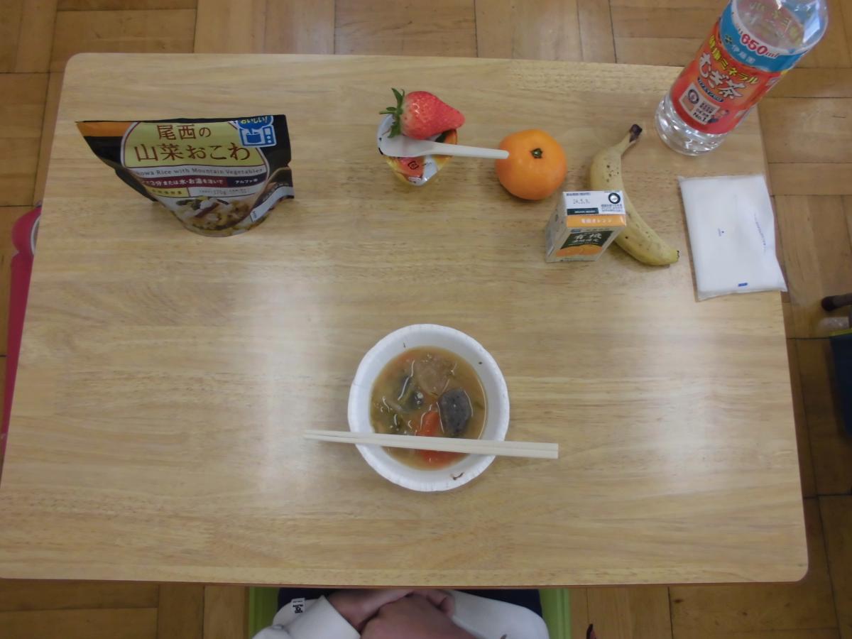 3限の授業を終えると、昼食です。今日はアルファ米のチャーハンとジュースでした。今日は3・4年生と一緒に食べましたが、担任と児童が和気あいあいと食べる様子に温かさを感じました。今日は特別にフルーツケーキつき。児童は「豪華~!」とつぶやきながら笑顔で全員完食していました。