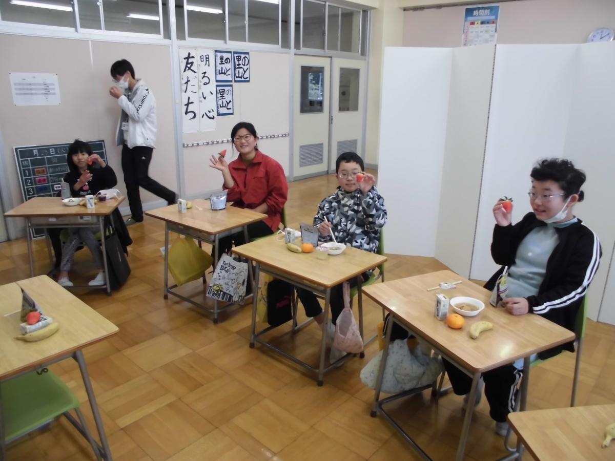 22日の昼食も、5~6年生と3~4年生に分かれていただきました。今日のメニューは山菜おこわ、お味噌汁(炊き出しより)、フルーツゼリー、バナナ、みかんでした。また、今日も皆口農園さんから、真っ赤ないちごをいただきました。