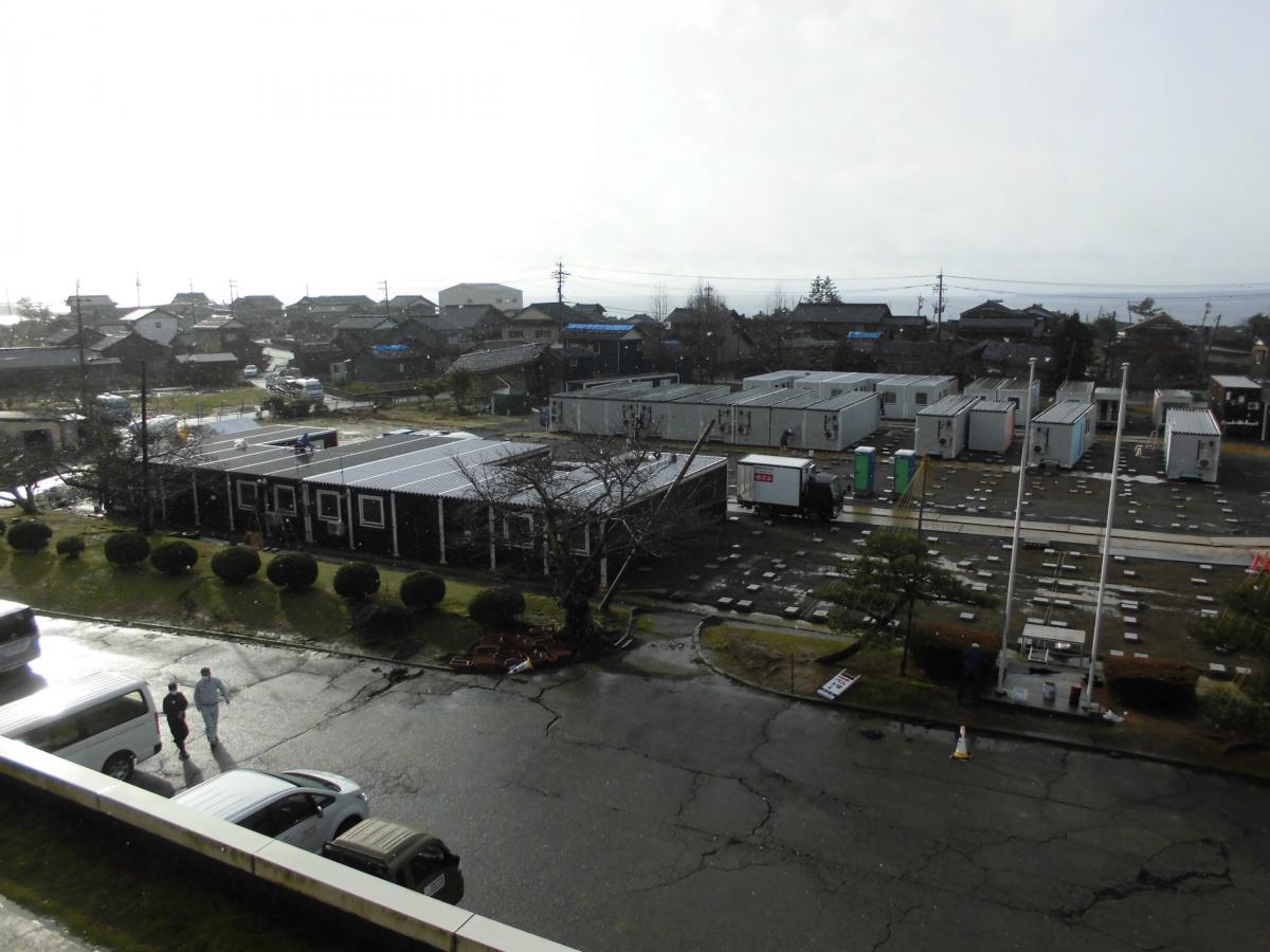 17日の朝、冷える日でしたが気持ちの良い冬晴れが、子どもたちを励ましてくれているような朝でした。グラウンドでの仮設住宅建設も着々と進んでいるようです。