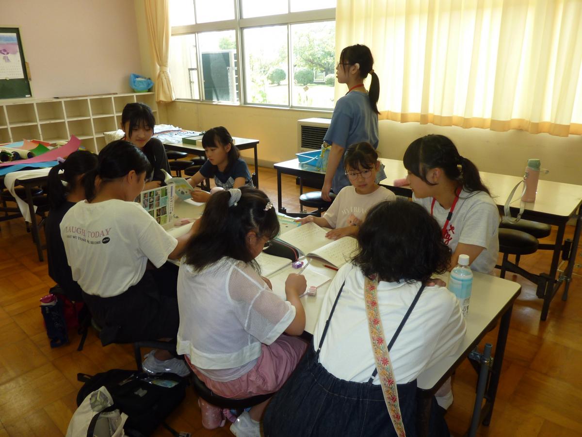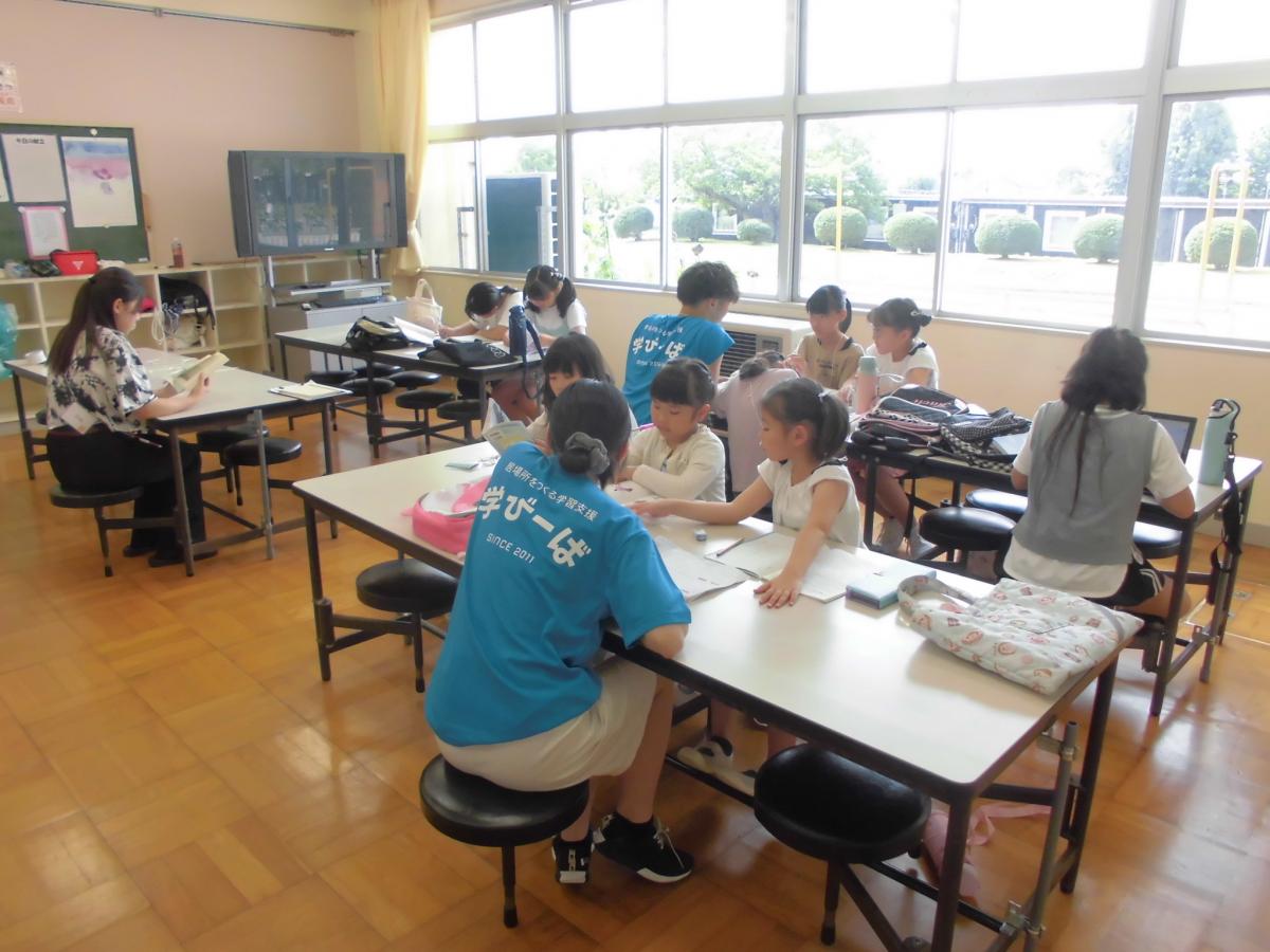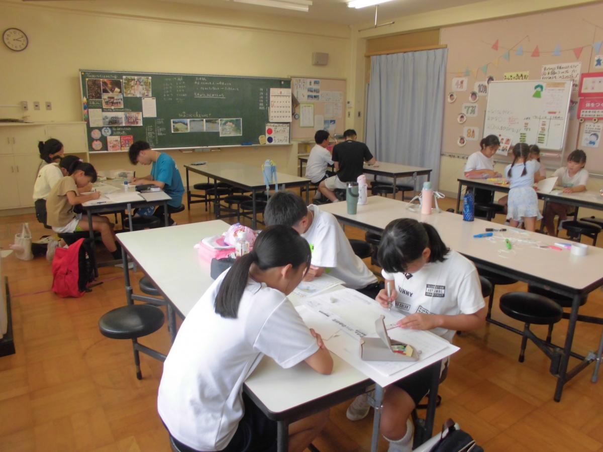 午後は、部活が終わった中学生も参加してくれました。地球市民学習さんへのお手紙を書き、明日の流しそうめんの準備を行いました。一方で、5年生は学びーばさんにアドバイスをいただきながら、夏休みの宿題の1つである作文にも取り組みました。