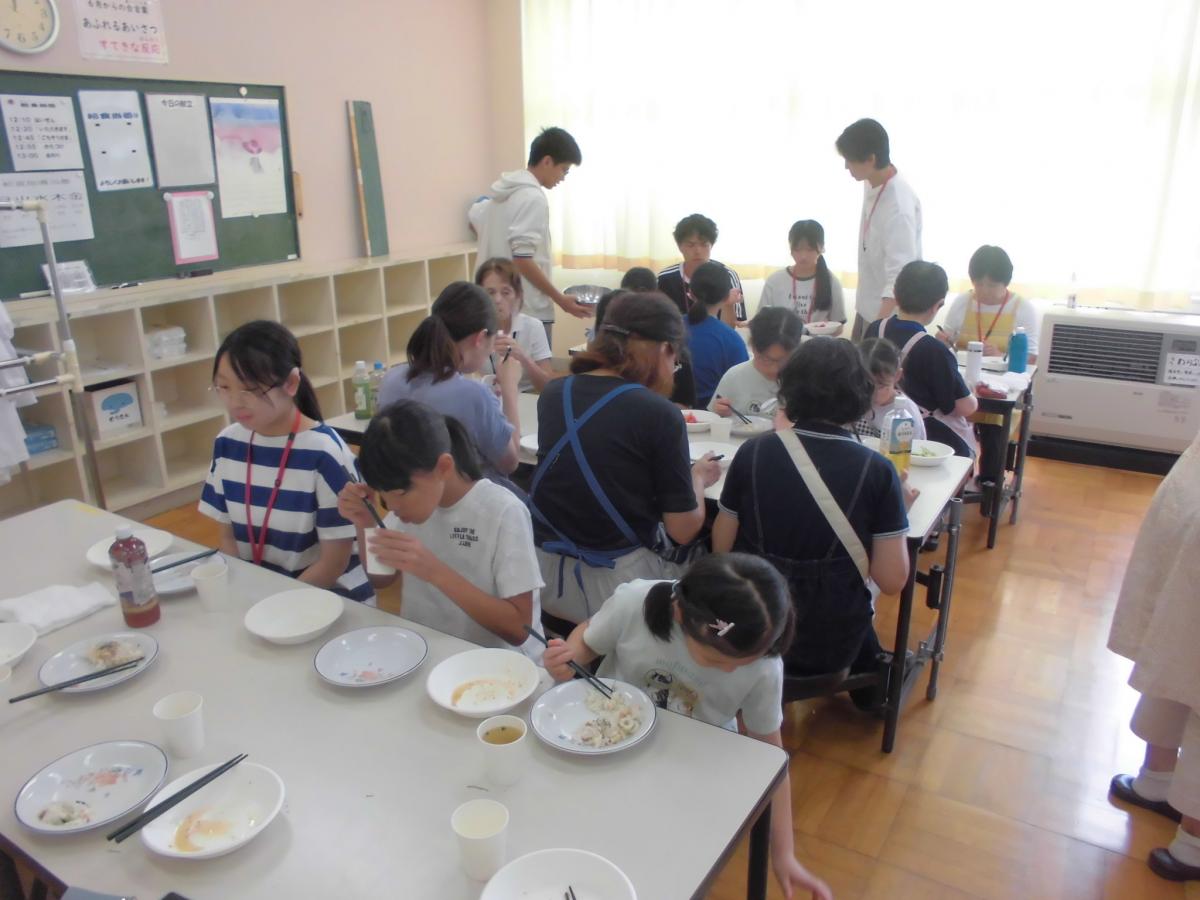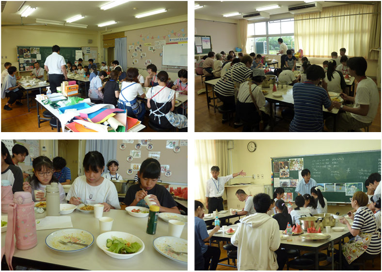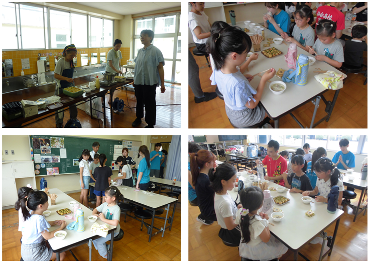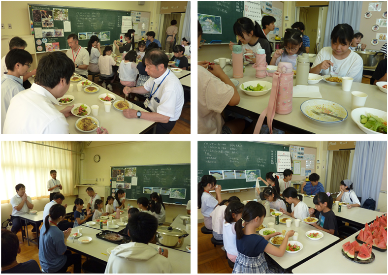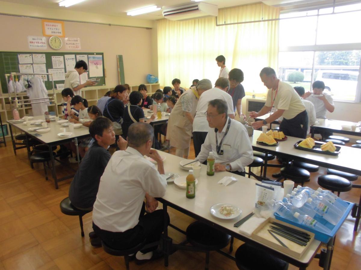 昼食は、本校職員も集って、みんなでいただきました。たくさん作っていただいたので、おかわりもできそうです。子どもたちは味わいながら、楽しく食べていました。デザートには、先週ご来校下さった大阪府・堀内さんからいただいた、本校の保護者が作った皆口スイカです。大玉1玉を切り分けて、みなさんで味わいました、感謝、感謝。