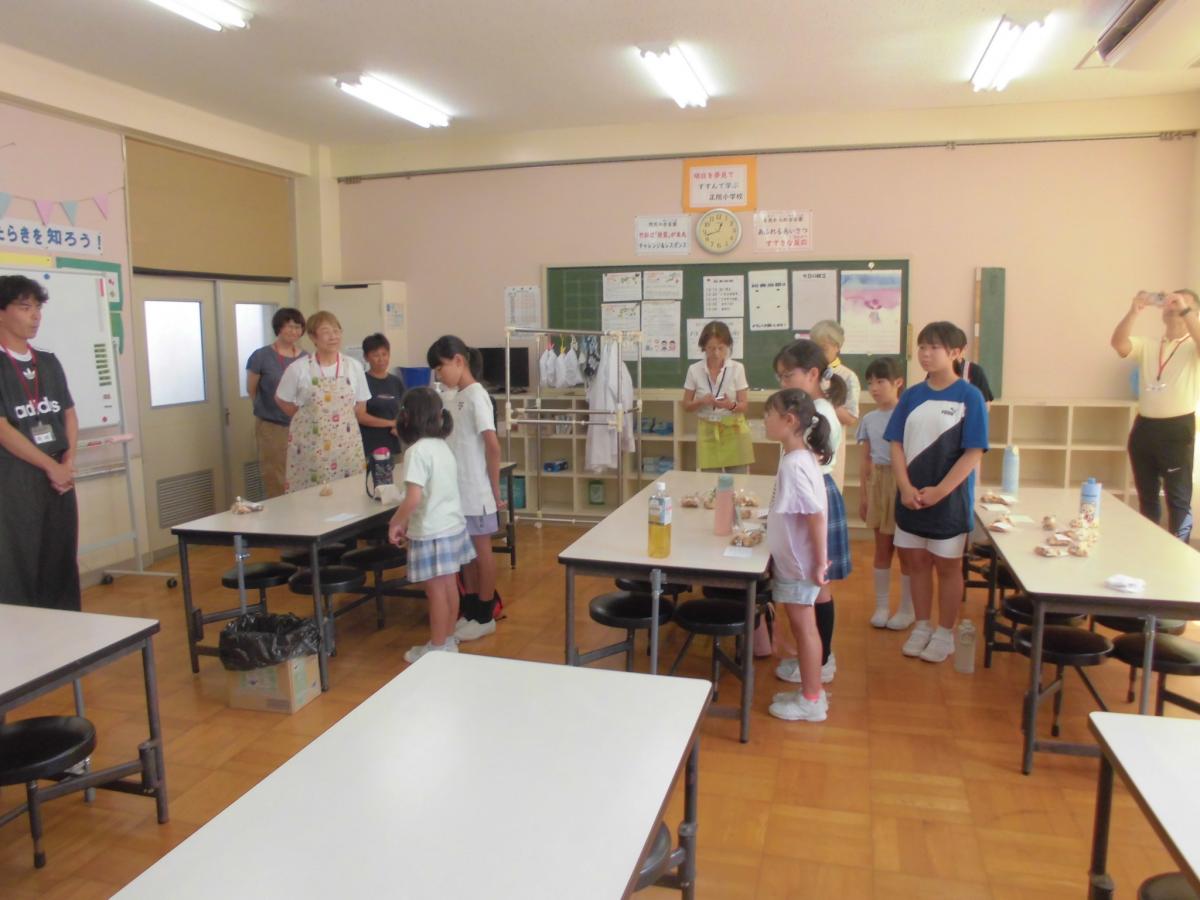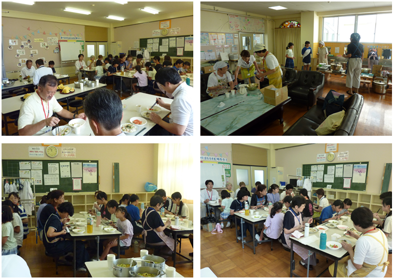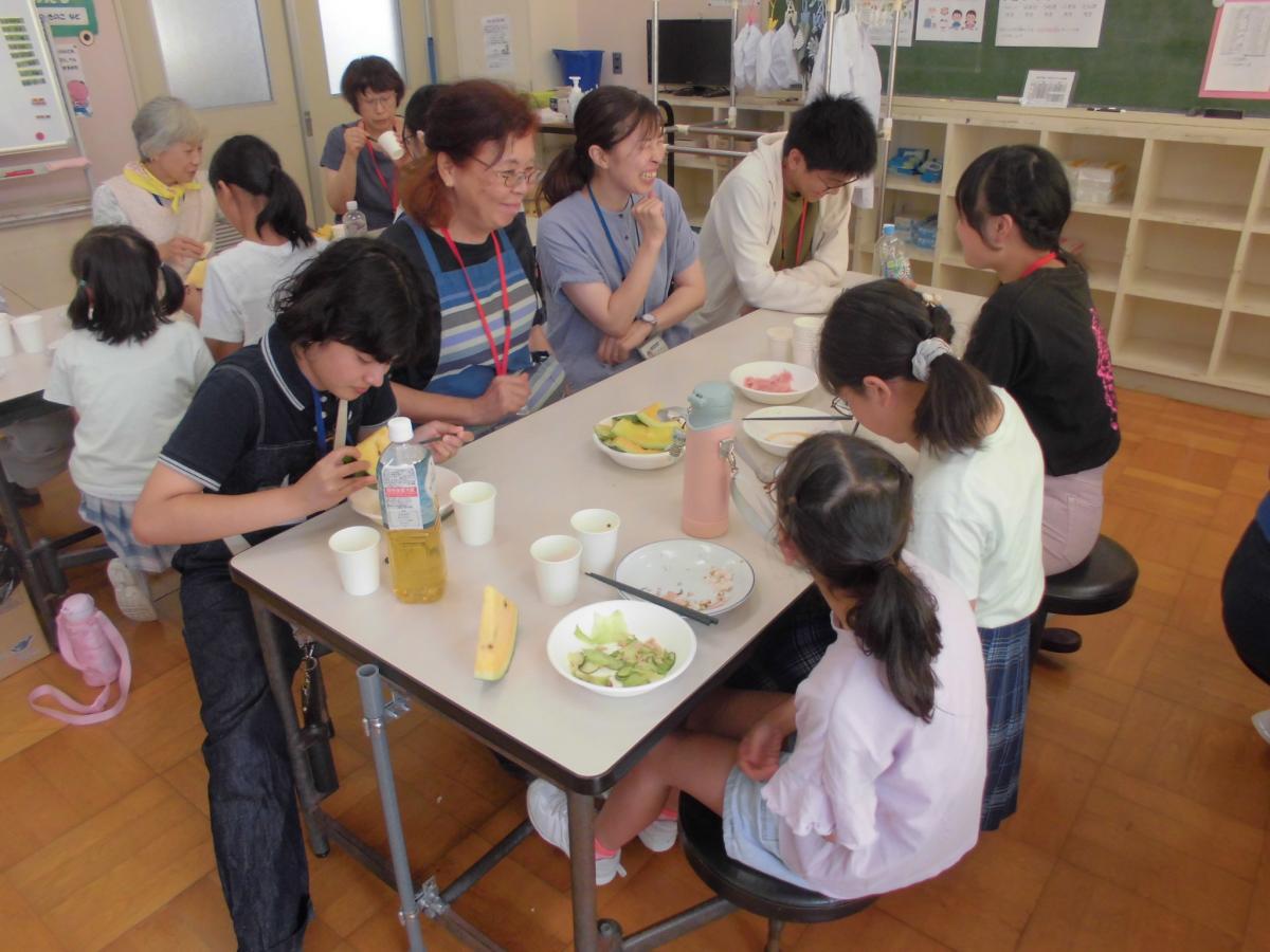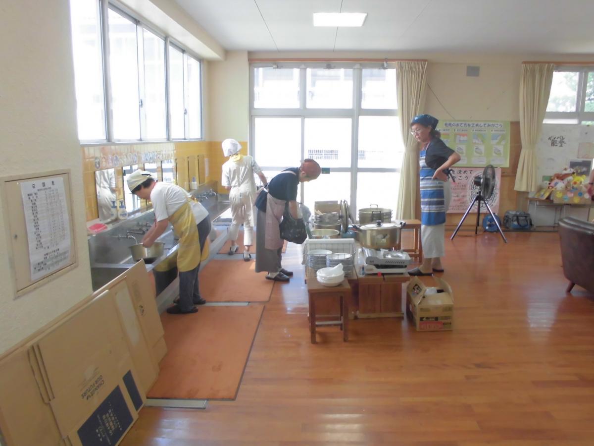 昼食は、本校職員も集って、みんなでいただきました。たくさん作っていただいたので、おかわりもできそうです。子どもたちは味わいながら、楽しく食べていました。デザートには、先週ご来校下さった大阪府・堀内さんからいただいた、本校の保護者が作った皆口スイカです。大玉1玉を切り分けて、みなさんで味わいました、感謝、感謝。