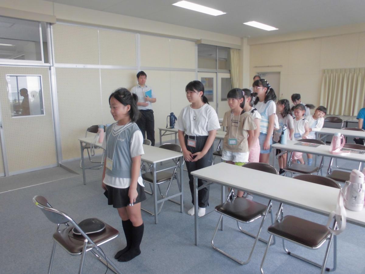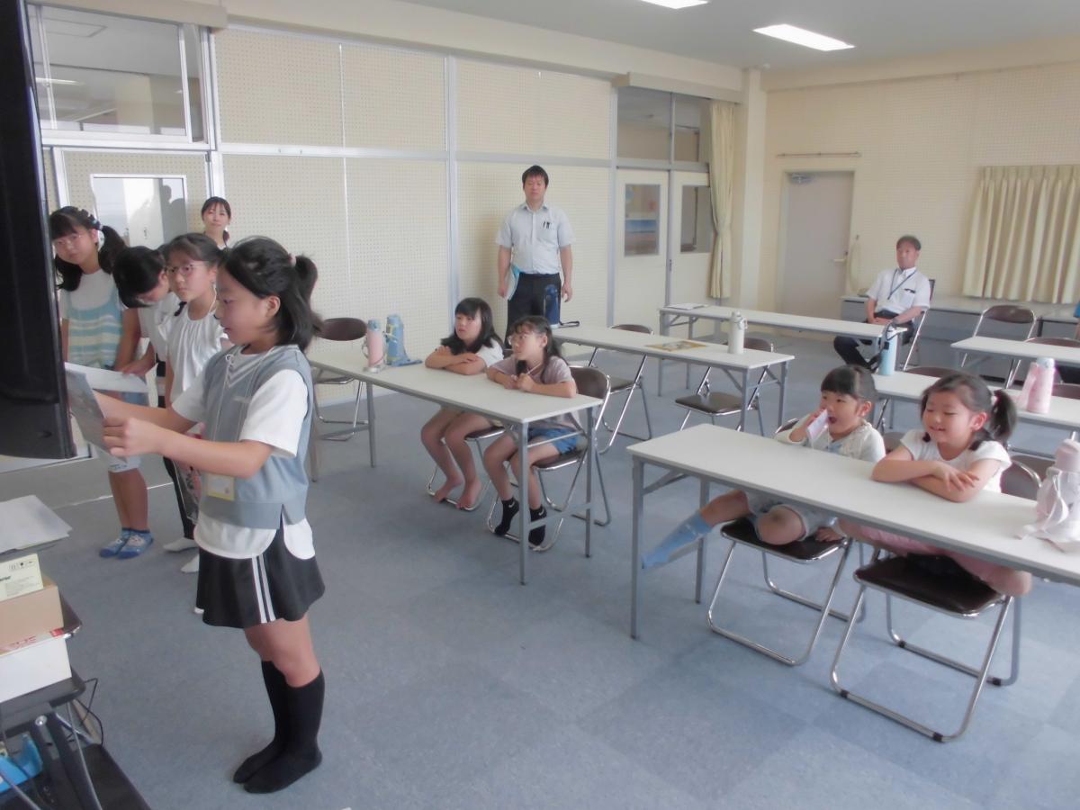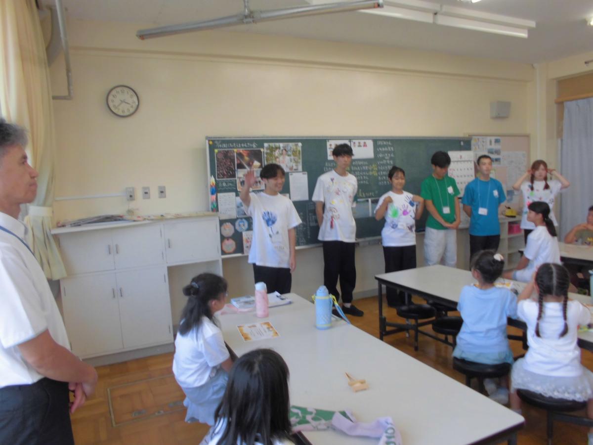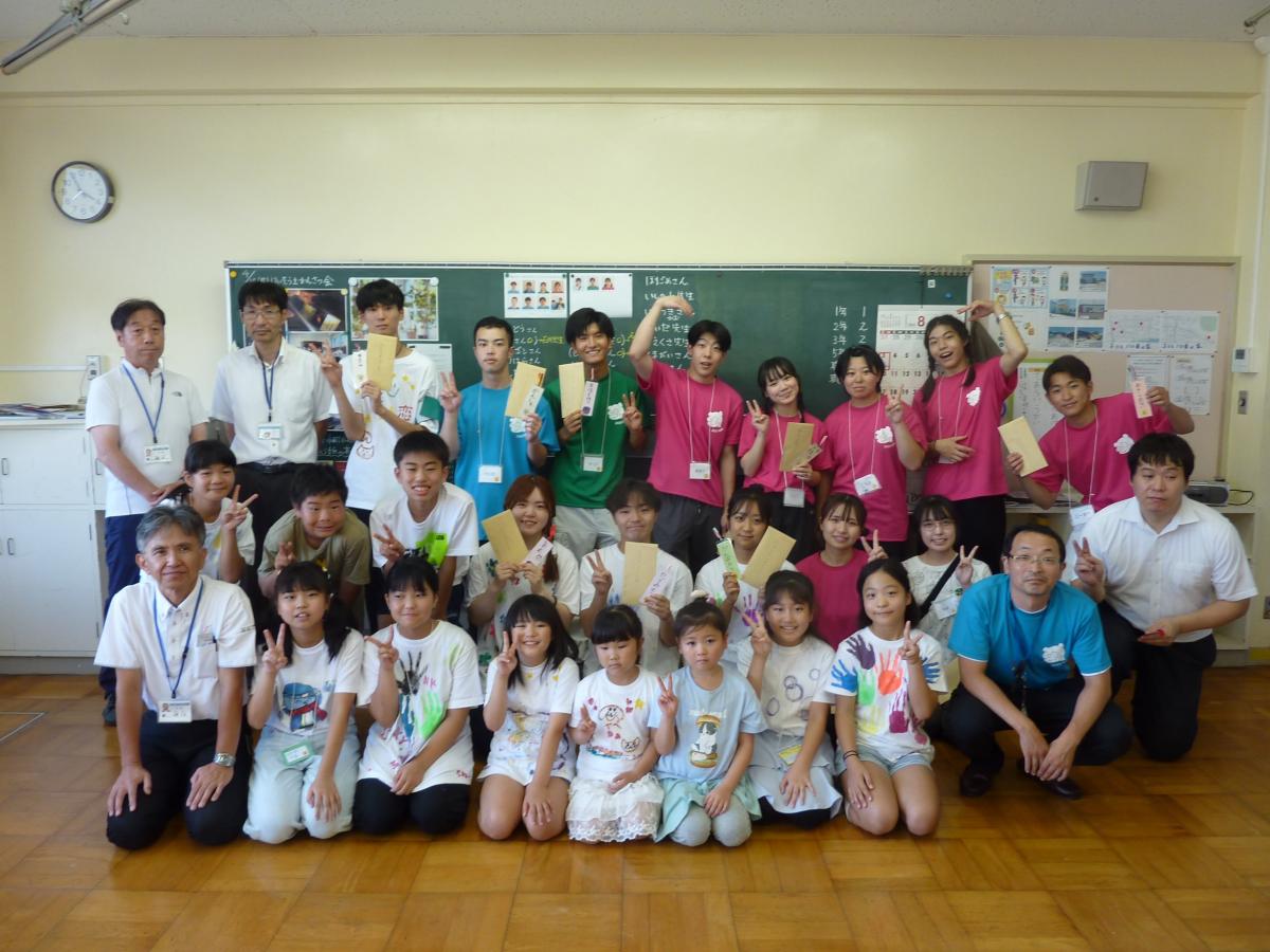 その後フリータイムで、約30分「学びーば」さんと児童が最後の交流活動を行って、いよいよ閉会式です。最初に校長から4回目の来校、5日間のプログラムへのお礼を伝え、次は「学びーば」のメンバー1人1人からこの5日間の感想を話していただきました。続いて、子どもたちからお礼として準備した「お手紙」と「しおり」をみんなで分担して「学びーば」1人1人に手渡しました。涙を流す方もいて、予定通り終わった安心感と楽しい5日間になった満足感を感じました。総勢20数名での慣れない合宿生活の中で、きっと疲れもあったと思いますが、最後まで子どもたちを楽しませようとがんばっていただいたことは、深く子どもたちの今年の夏の素敵な思い出になったと思います。