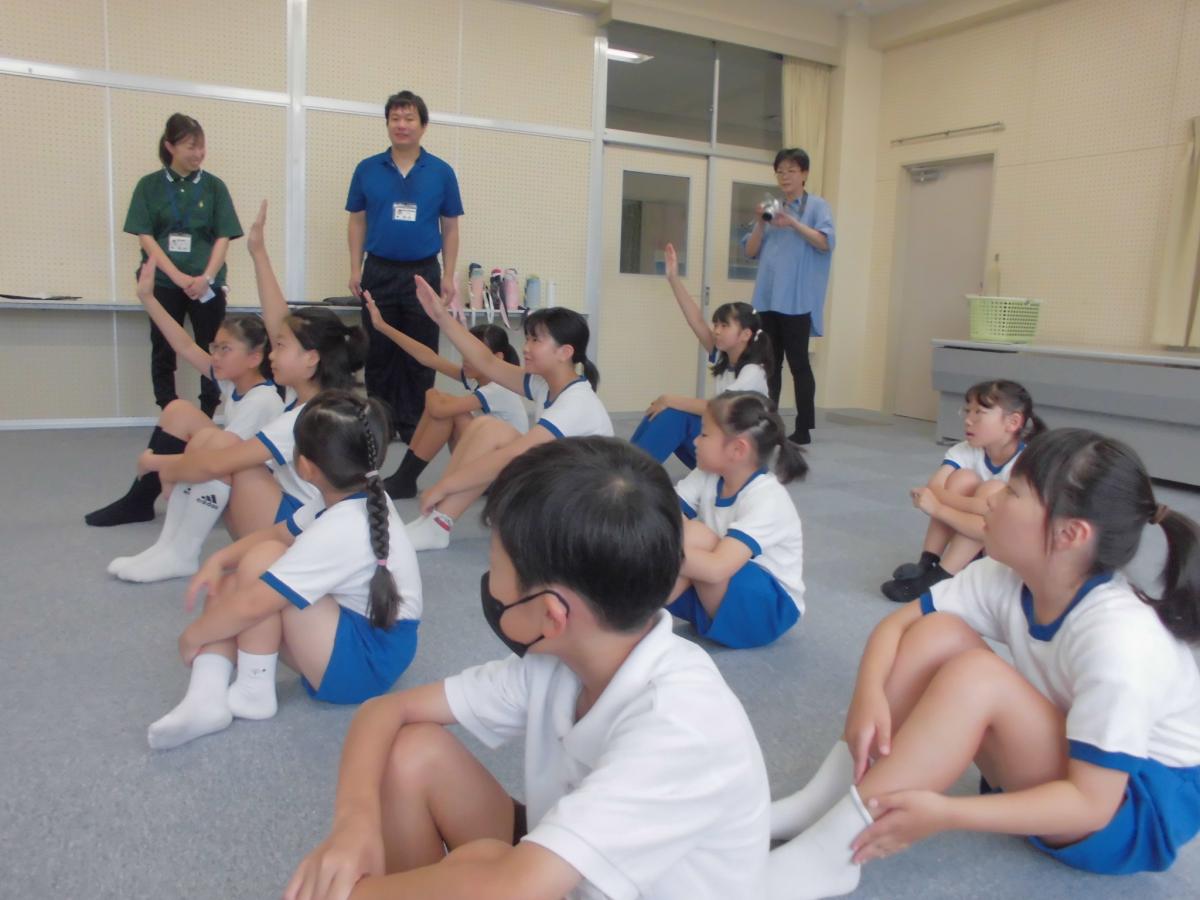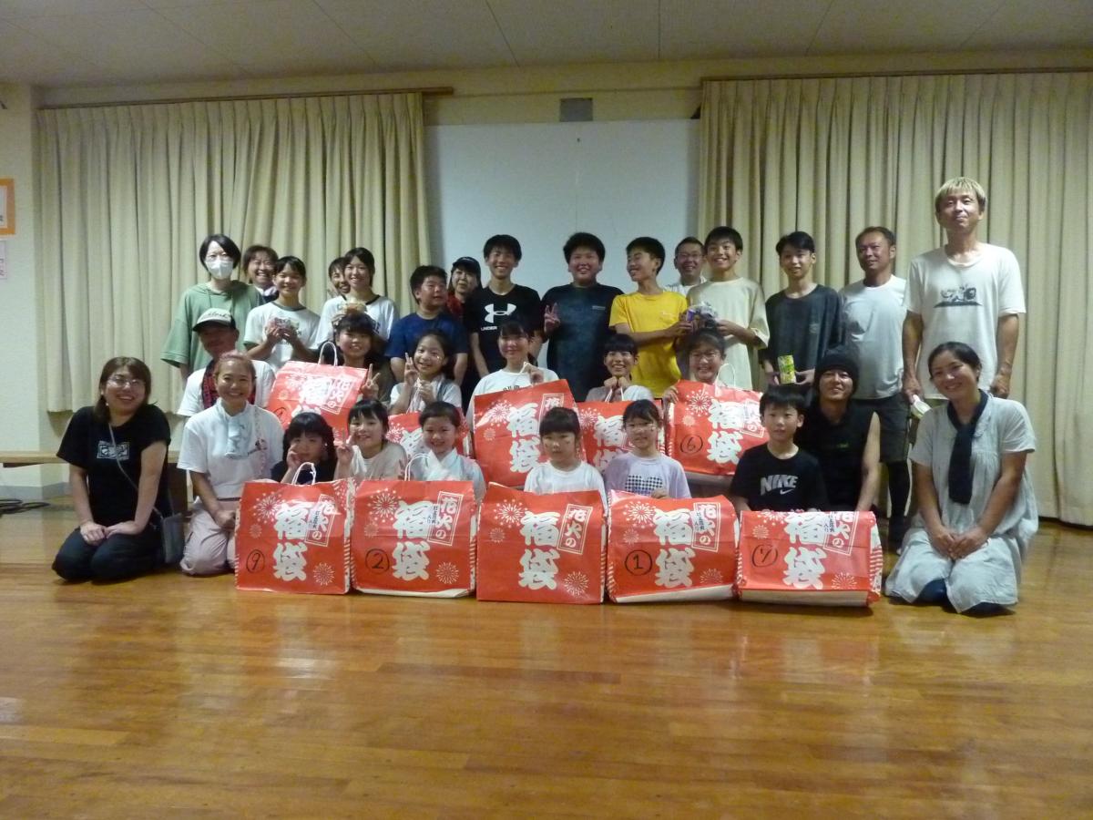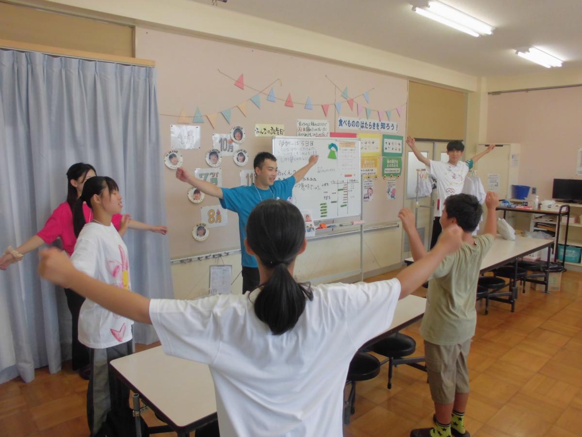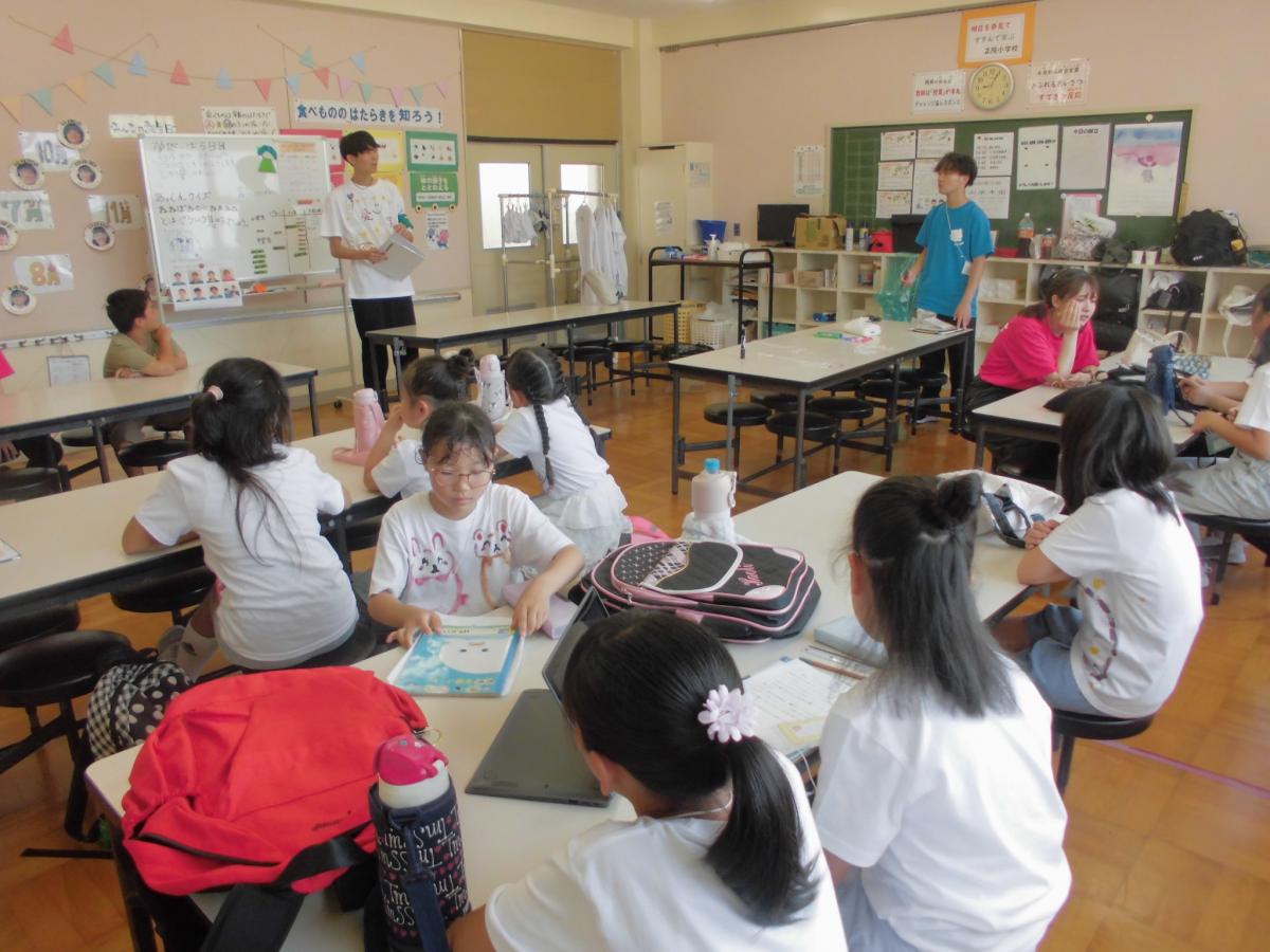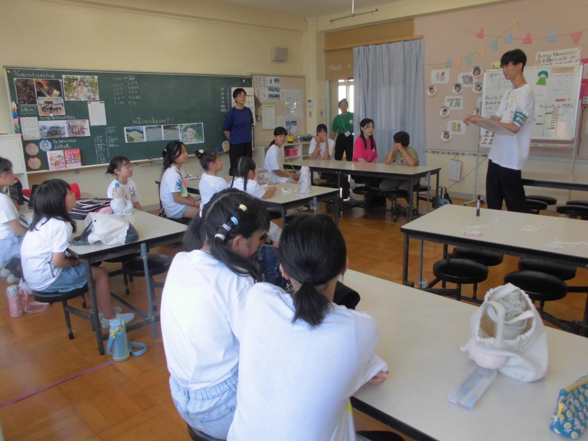 その後フリータイムで、約30分「学びーば」さんと児童が最後の交流活動を行って、いよいよ閉会式です。最初に校長から4回目の来校、5日間のプログラムへのお礼を伝え、次は「学びーば」のメンバー1人1人からこの5日間の感想を話していただきました。続いて、子どもたちからお礼として準備した「お手紙」と「しおり」をみんなで分担して「学びーば」1人1人に手渡しました。涙を流す方もいて、予定通り終わった安心感と楽しい5日間になった満足感を感じました。総勢20数名での慣れない合宿生活の中で、きっと疲れもあったと思いますが、最後まで子どもたちを楽しませようとがんばっていただいたことは、深く子どもたちの今年の夏の素敵な思い出になったと思います。