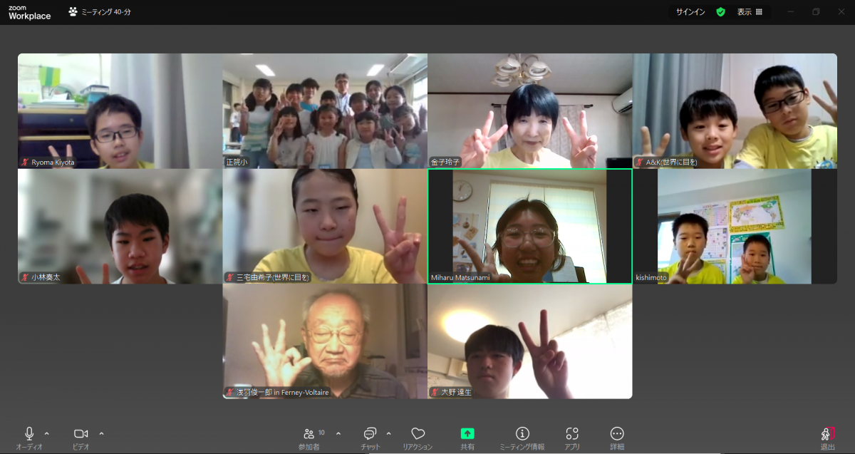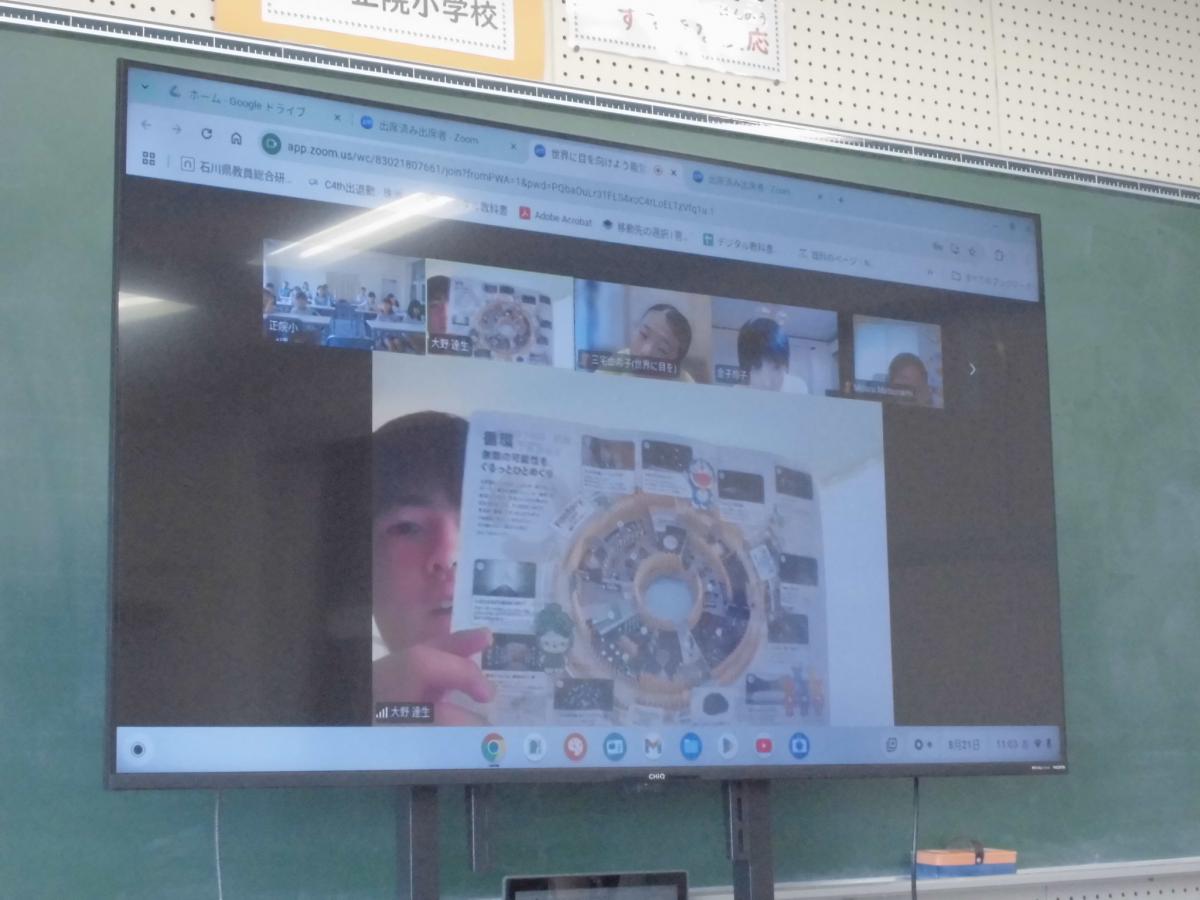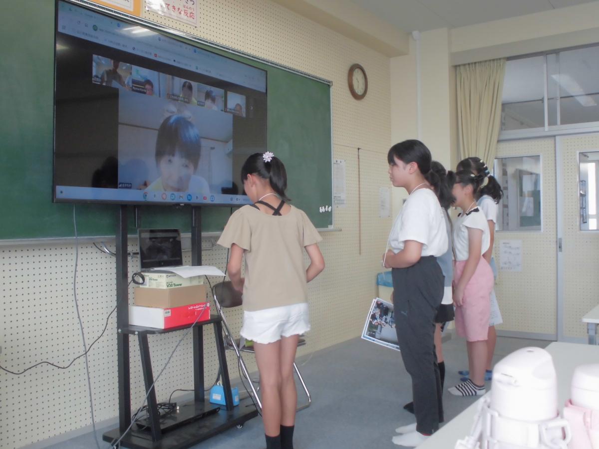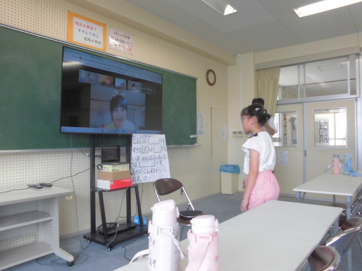 10時からは、場所をランチルームから会議室に移動し、埼玉県【地球市民学習】とのオンライン交流が始まりました。最初はHappy Greeting、それぞれ自己紹介と近況報告を行いました。地球市民学習の皆さんは、名前とこの夏休みに行ったところや行ったことなどを報告してくれました。特に、夏休みに旅行に出かけたことの報告が多くありました。本校児童は、名前と好きな〇〇について紹介できました。
