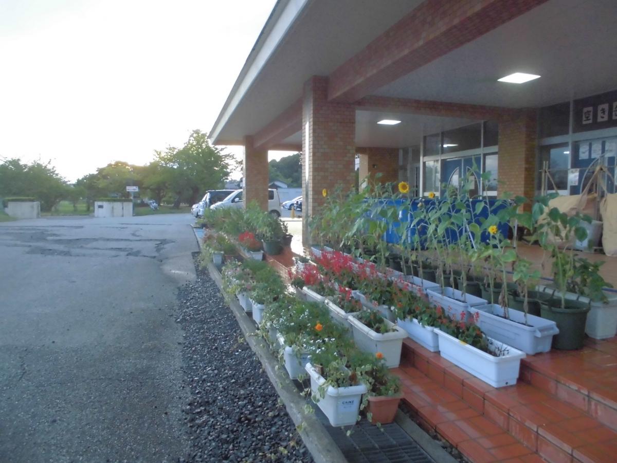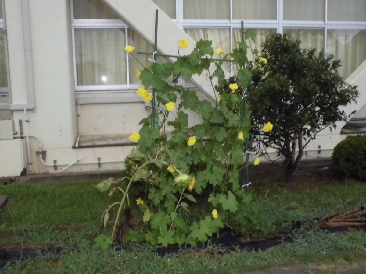 27日(水)、今朝は夜明け前から少し強い雨が降る朝となりました。今日は、夏休み最後の全校登校日。児童が登校する時間帯は小康状態、そんな中ほとんどの児童は、保護者に送ってもらっての登校となりました。玄関前の花々は元気。へちまも稲も元気に育ち、子どもたちを応援してくれています、感謝!