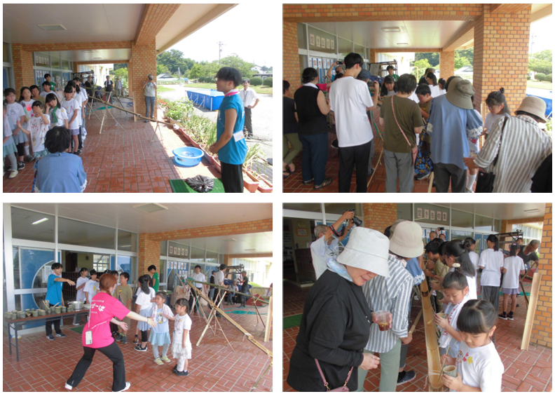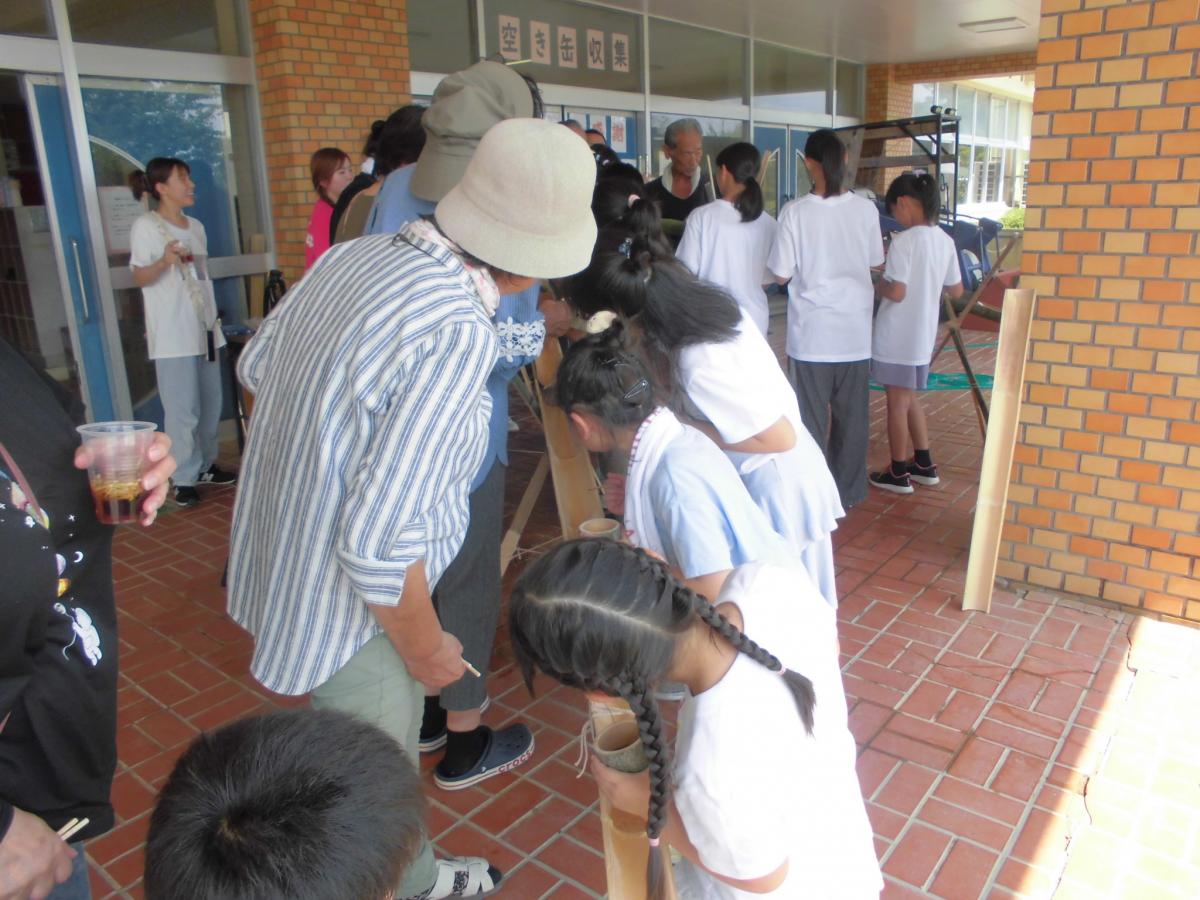 12時からは学校玄関前で流しそうめんです。準備が遅れて、15分遅れのスタートとなりましたが、予想以上に地域の皆さんにもご参加いただき、皆さんで楽しく流しそうめんをいただくことができました。時々流れる一口ゼリーやきゅうり、かまぼこ、みかんの缶詰等には懸命に箸をだして食べる姿が見られました。