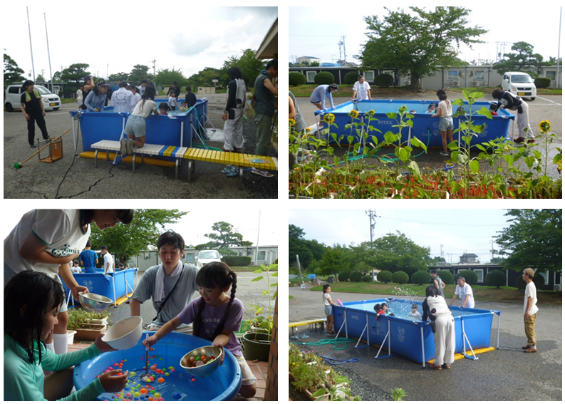 まずは朝から保護者の方にご準備いただいたプールでの水遊びから始まりました。遊ぶ道具も、水風船やその他いろいろ工夫して持ち寄って、まさに夏の遊びをみんなで楽しみました!