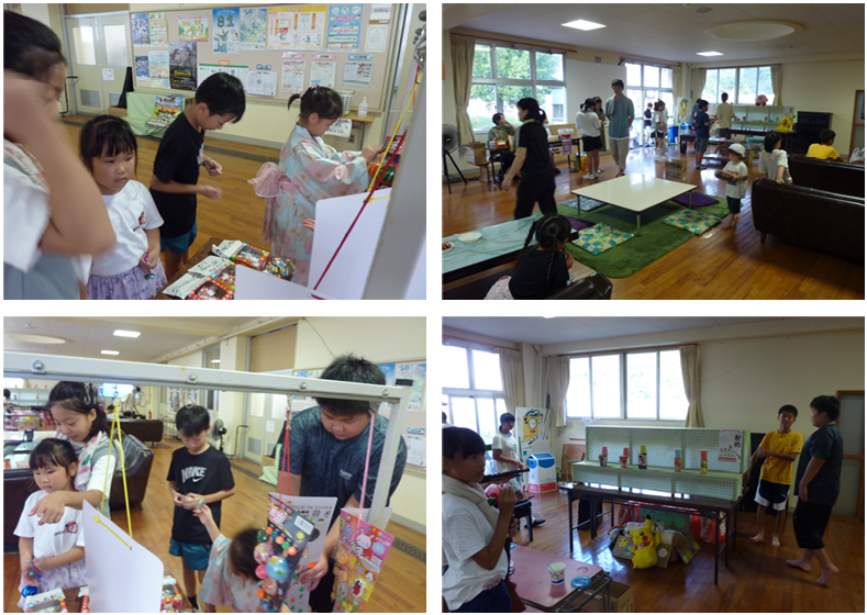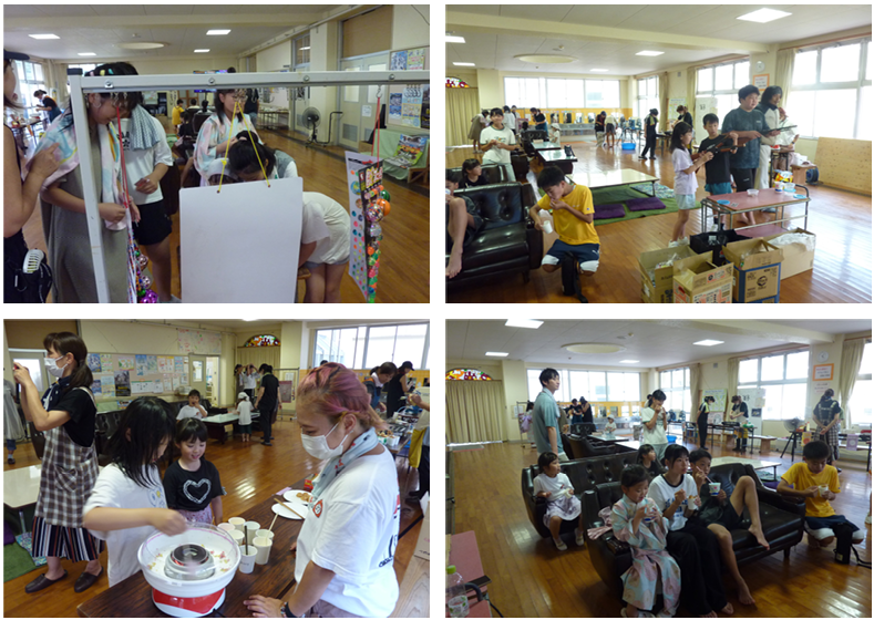 約2時間、水遊びを思う存分楽しんだ後は、着替えて出店ごっこです。かき氷やわたがし、ベビーカステラやたこせん、カラオケ、射的とみんな子どもたちが体験したり、自分たちで運営したりとみんなで楽しく出店を楽しみました。