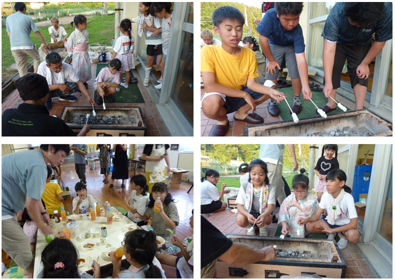 午後6時ごろからは並行してバーベキューも開始。フランクフルト、マシュマロや焼きおにぎり等をみんなで楽しく味わいました。