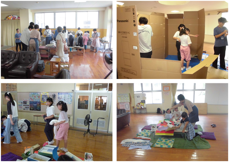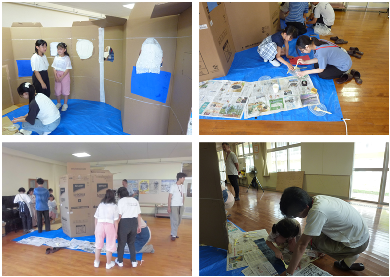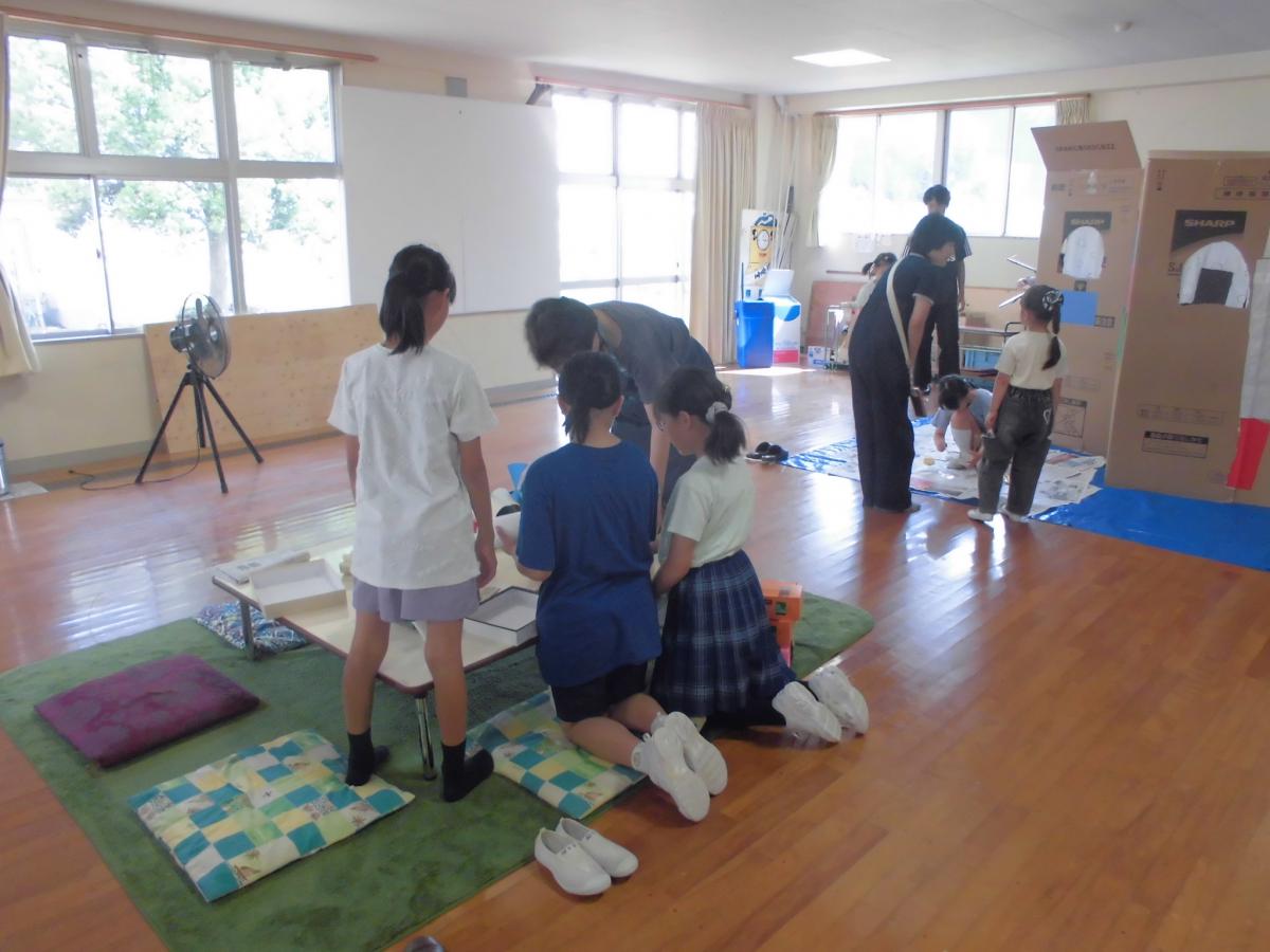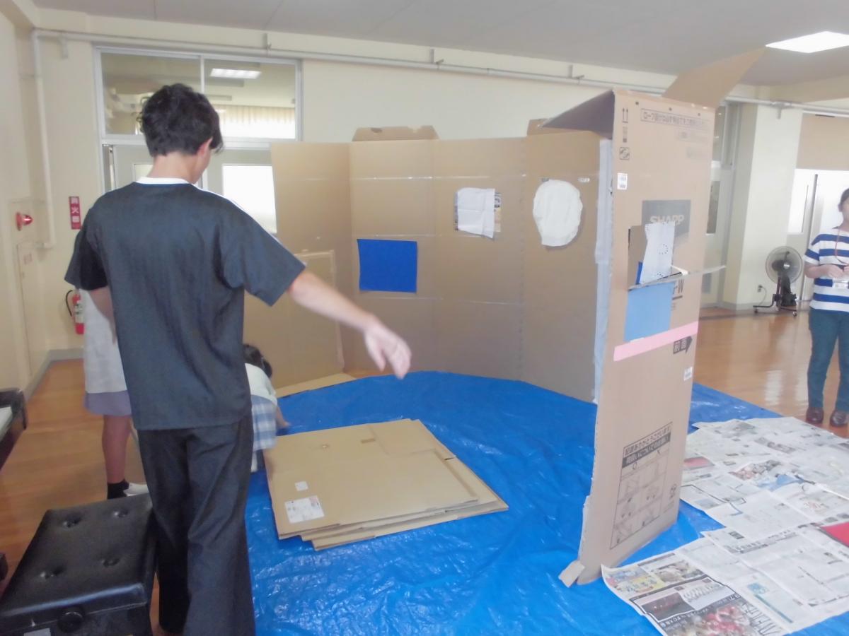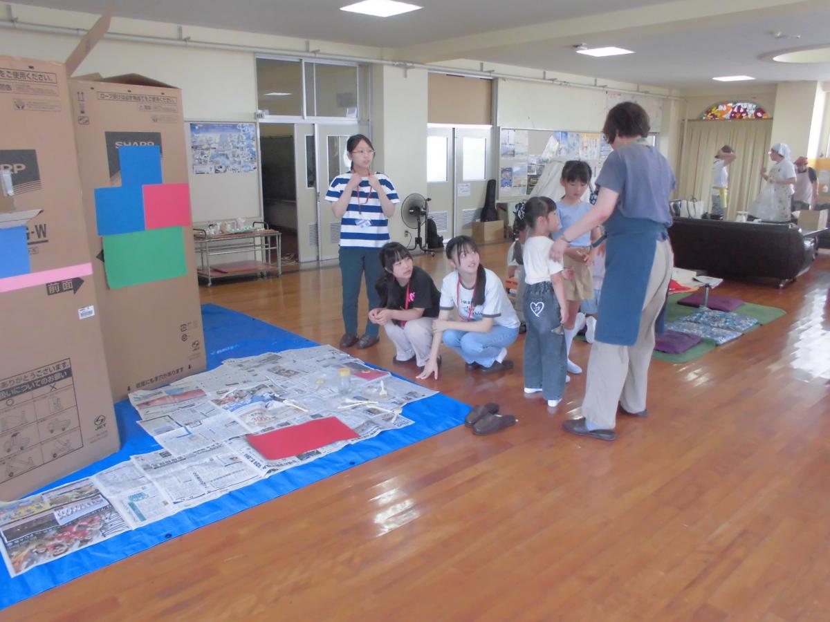 9時半ごろ到着されると、参加している子どもたちを確認して、早速昨日の図工の続きです。大きな段ボールを使って子どもたちの秘密基地らしきものを作るようです。約1時間、自由学園の大学生や高校生にサポートしてもらいながら自由に秘密基地づくりに取り組む姿が見られました。
