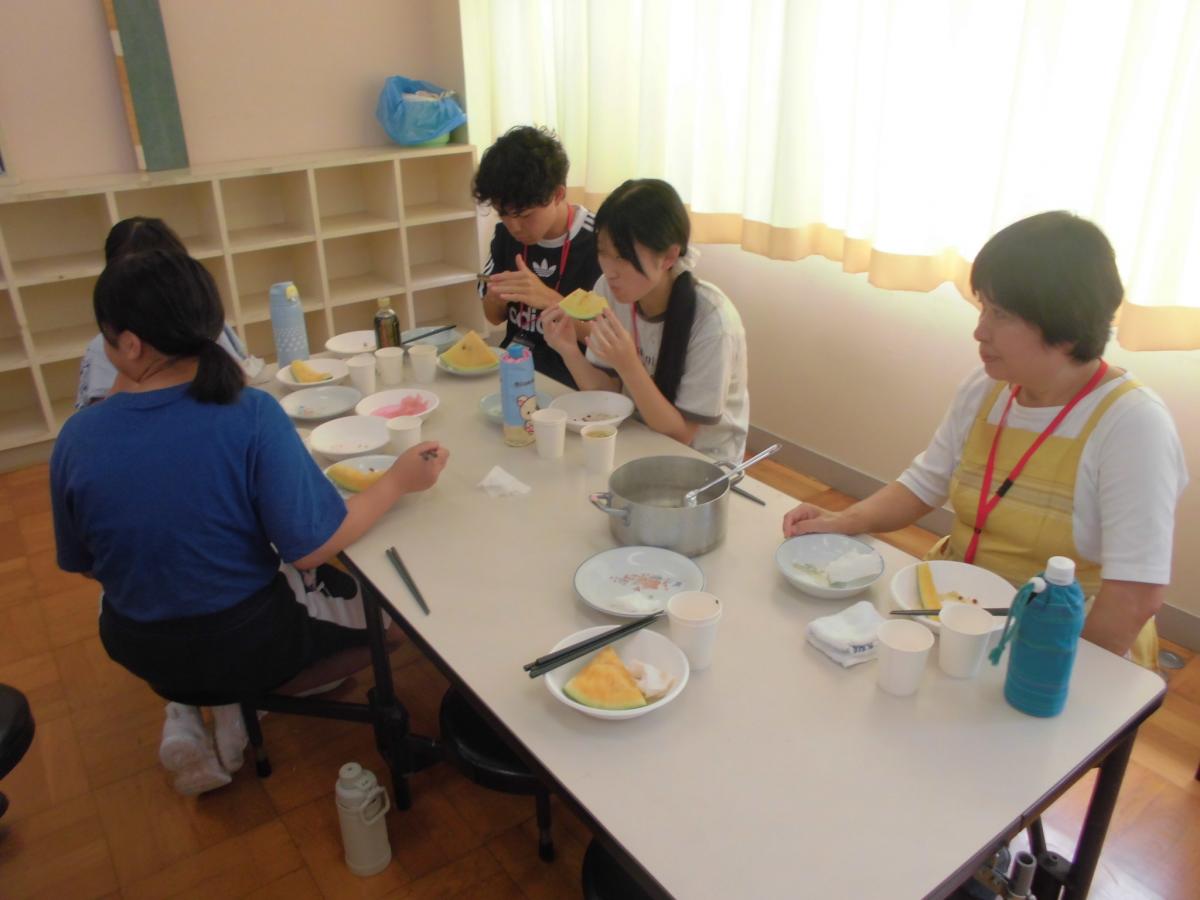 職員もご招待いただき、皆さんランチルームで、一緒に美味しい昼食をいただきました。今日も、本校PTA会長である皆口さんからいただいた黄色いスイカも一緒にいただきました。短いながらも楽しい食事の時間も共有できました。